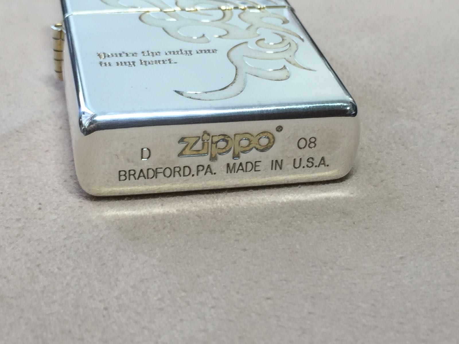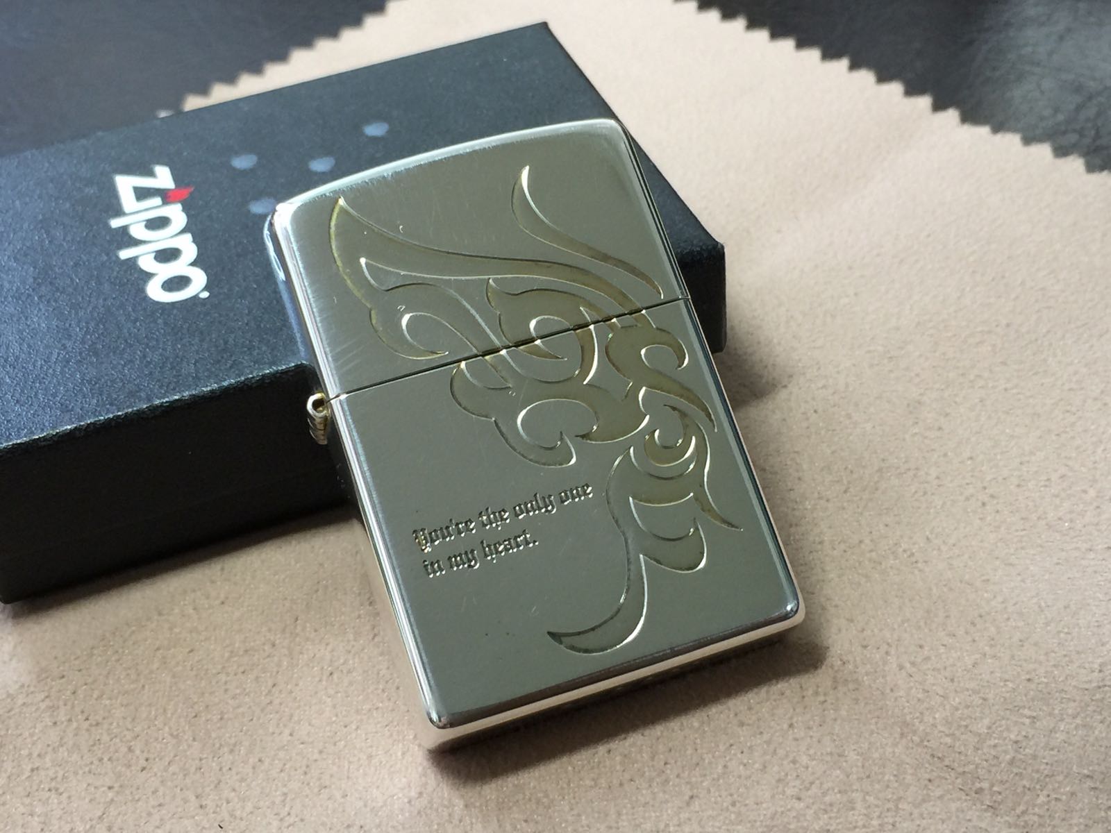 【具体描述】2008年4月 镀银蚀刻填漆工艺 蝶翼,正面蚀刻You're the only one in my heart 你是我心中的唯一。该机为对机中的一枚 原机一周镀金,因保存不当氧化 做了抛光处理,镀金层已基本抛掉,介意勿拍。机身局部擦丝擦痕强光拍出,无磕碰。铰链正常,原配同年同月内胆未点火,防风墙轻微开合盖擦痕,总体定义近新品相,黑纸盒包装。