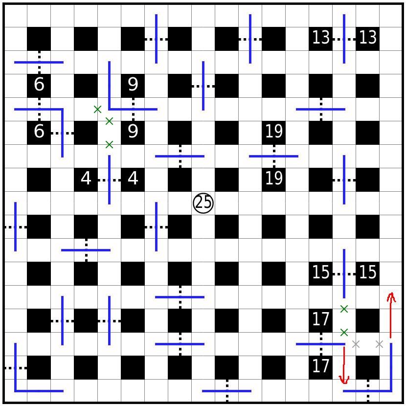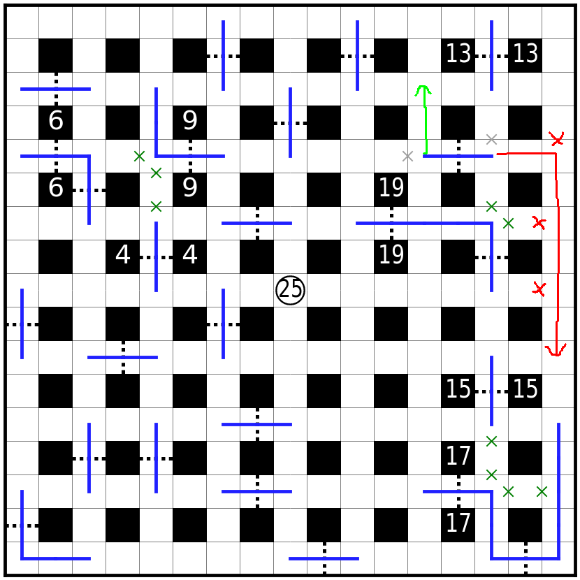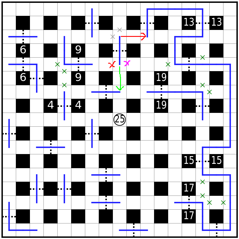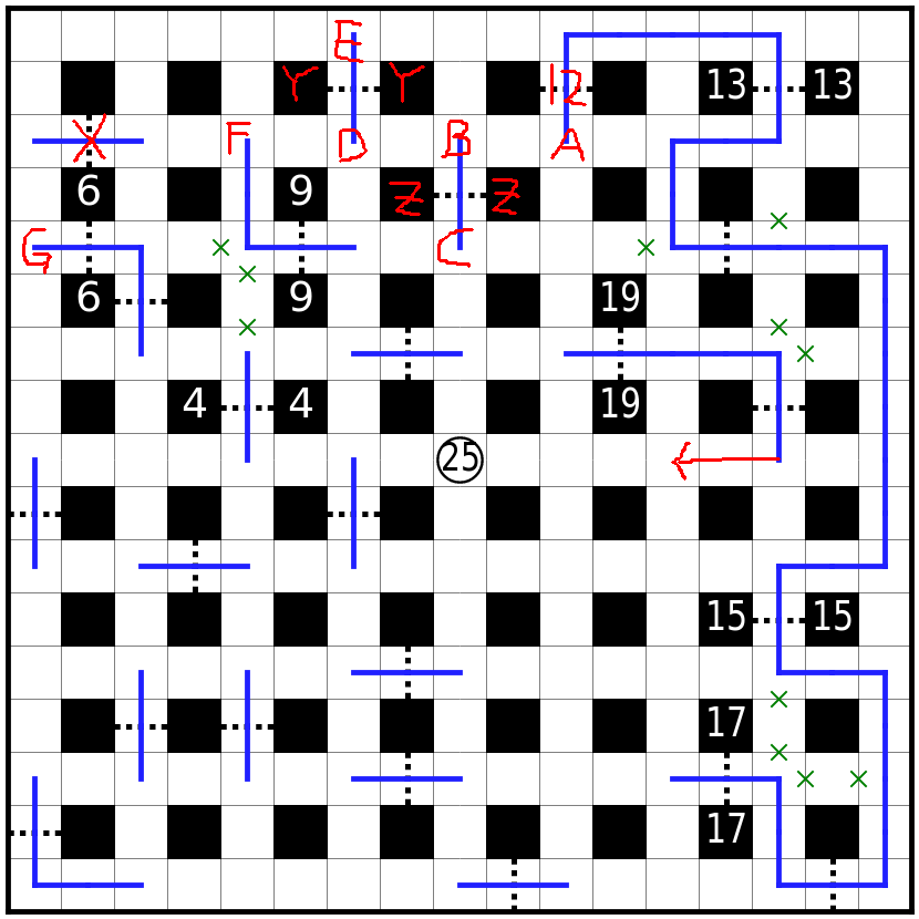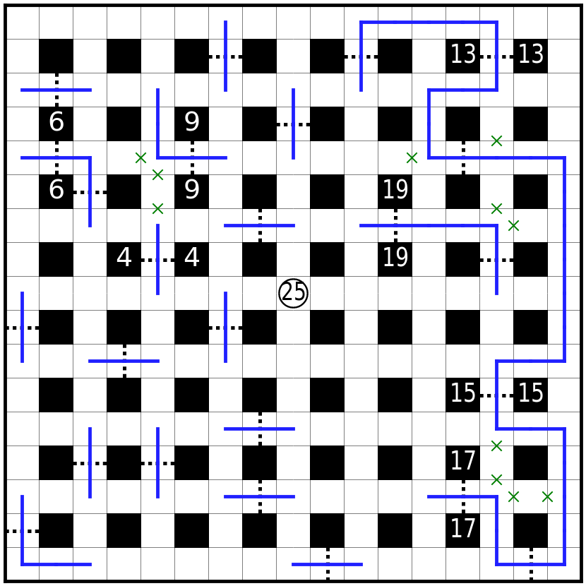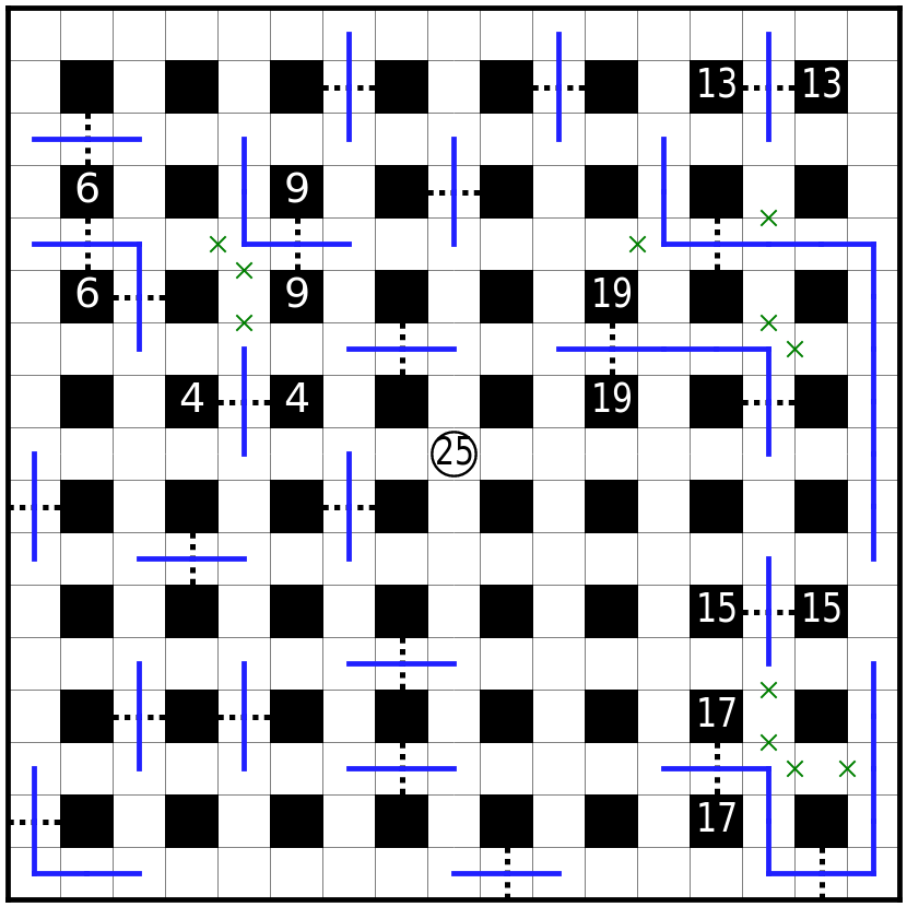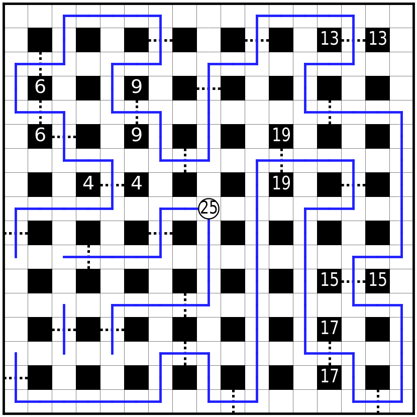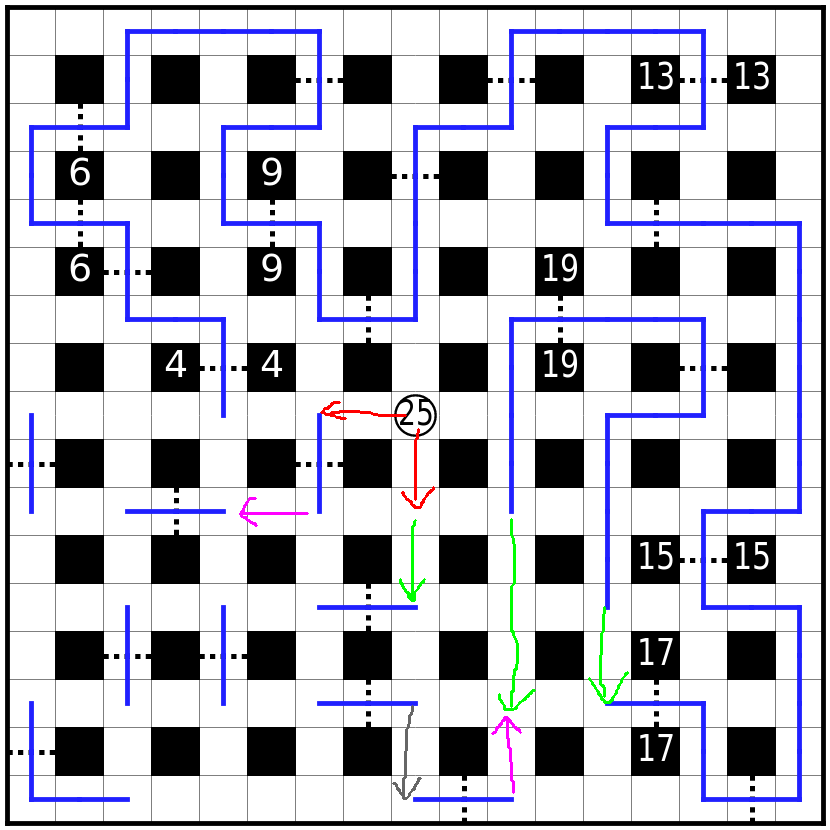 虚线格为关口,路线必须贯穿每个关口其中一格。必须直线通过虚线。