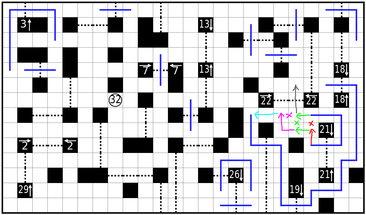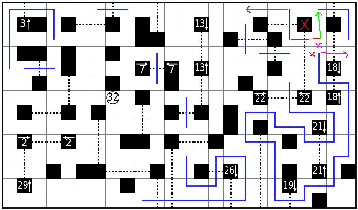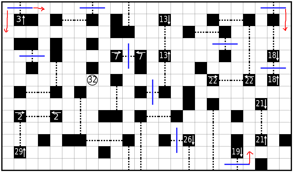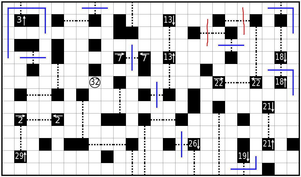 虚线格为关口,路线必须贯穿每个关口其中一格。必须直线通过虚线。