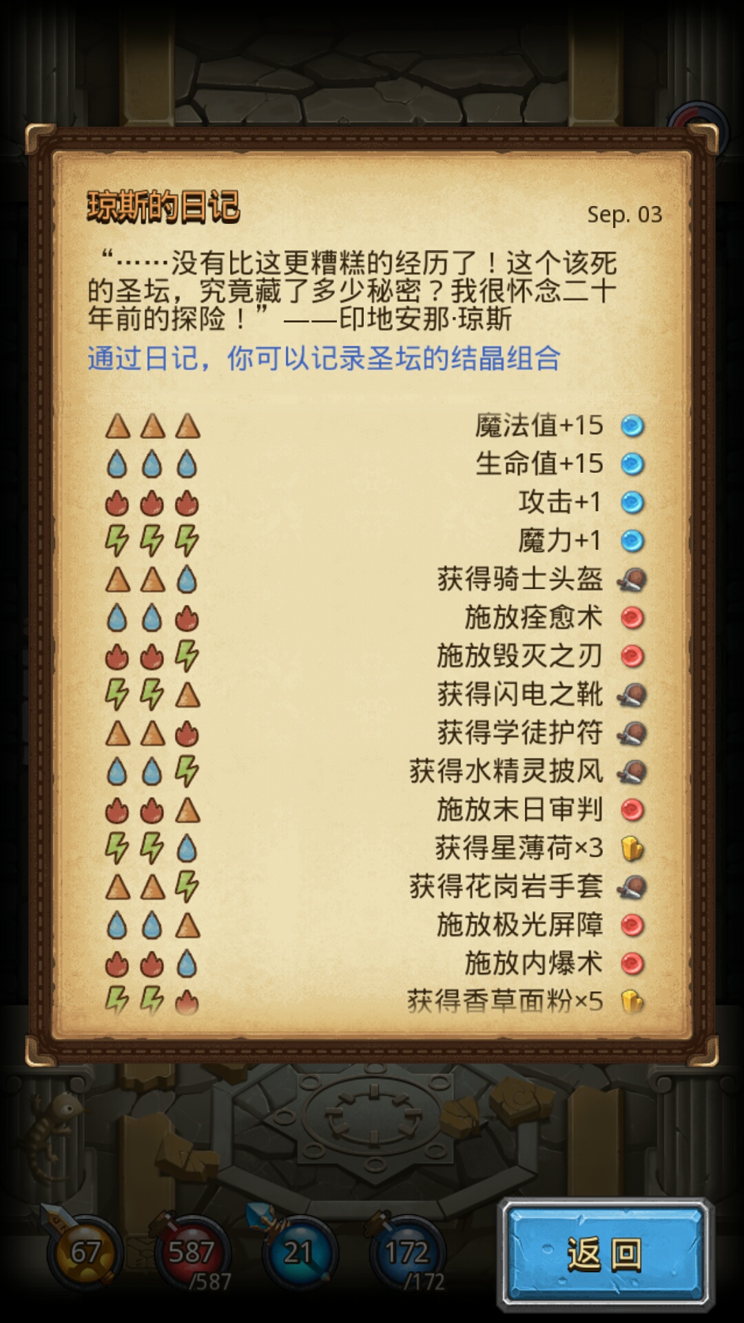 放入元素结晶,出现各种效果;前两个结晶可对不同系元素怪造成伤害,同系怪免疫。