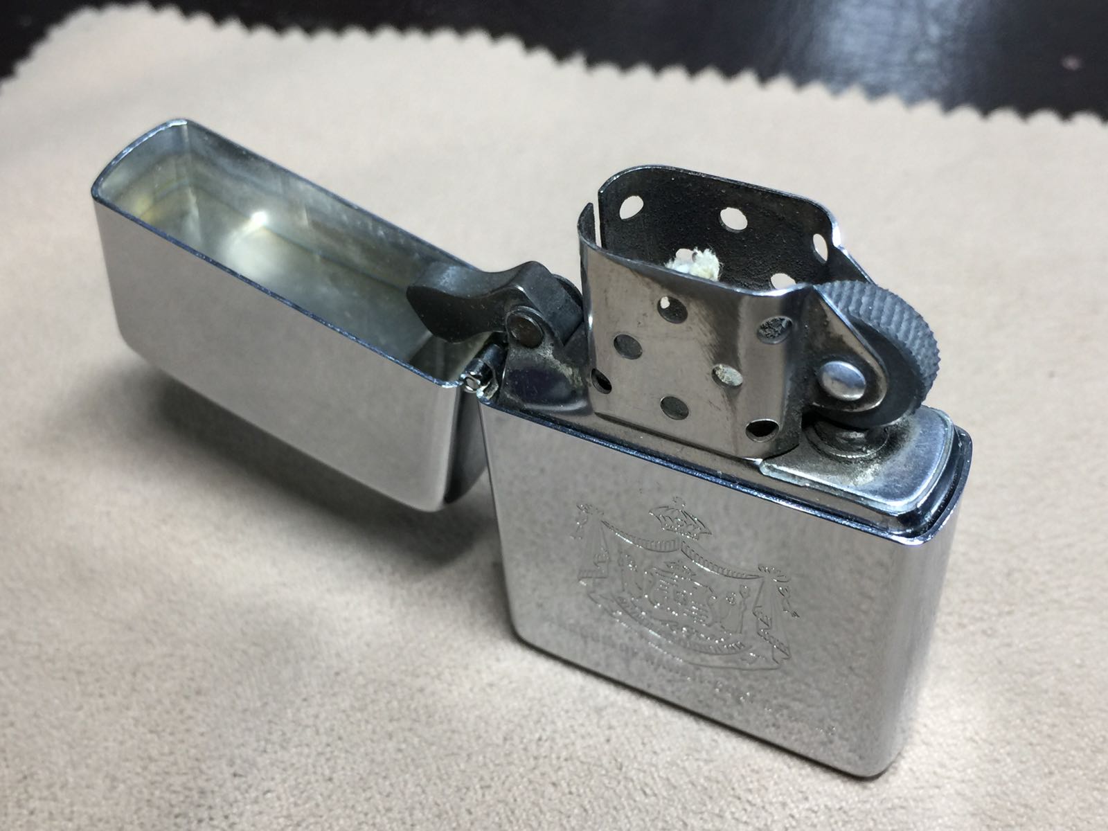 【具体描述】二手1985年 镜面蚀刻 夏威夷皇室徽章 反底刻。机身正常使用擦丝浅划痕,顶部小磕伤和几粒针眼微距拍出,无大伤。铰链正常,后配01I内胆已更换全新进口火轮,打火强劲,无包装。
