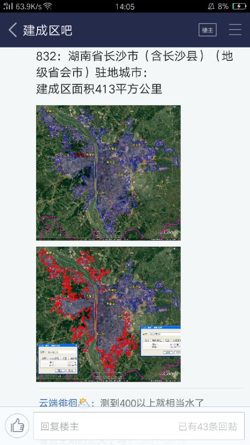 第三名,长沙,建成区413平方公里。