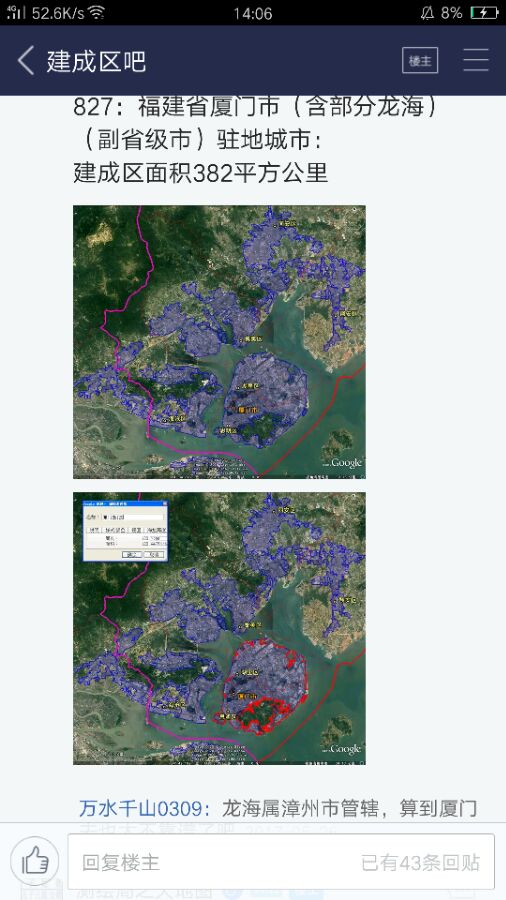 第八名,厦门,建成区382平方公里。