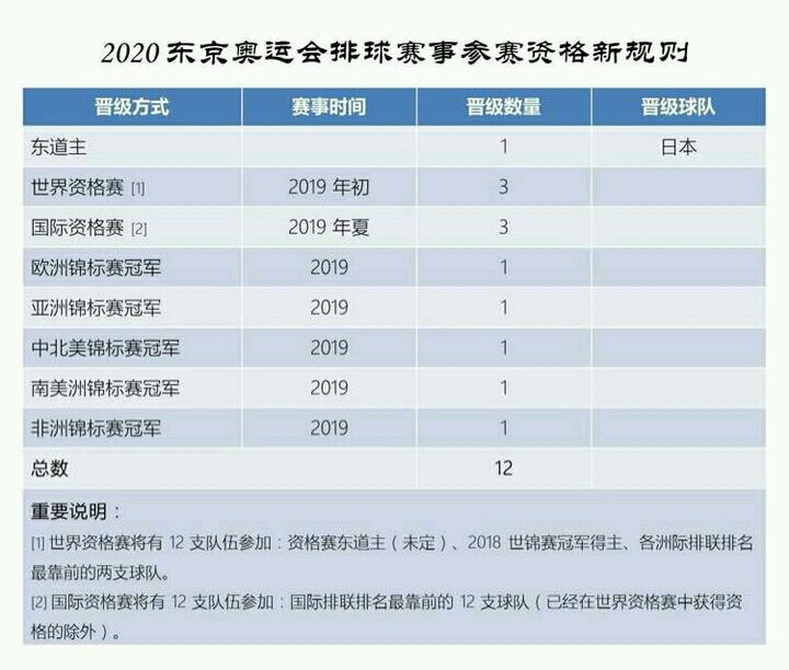 【2020 东京奥运会排球赛事 12 个参赛名额分配新办法】来自排球世界的消息:国际排联已重新制定 2020 东京奥运会排球赛事门票规则:世界杯将不诞生奥运资格,但各洲排联的排名和国际排联的排名变得尤为重要。具体的名额分配办法请狂戳下图。目前,国际排联已经将办法递交国际奥委会。(消息来源
