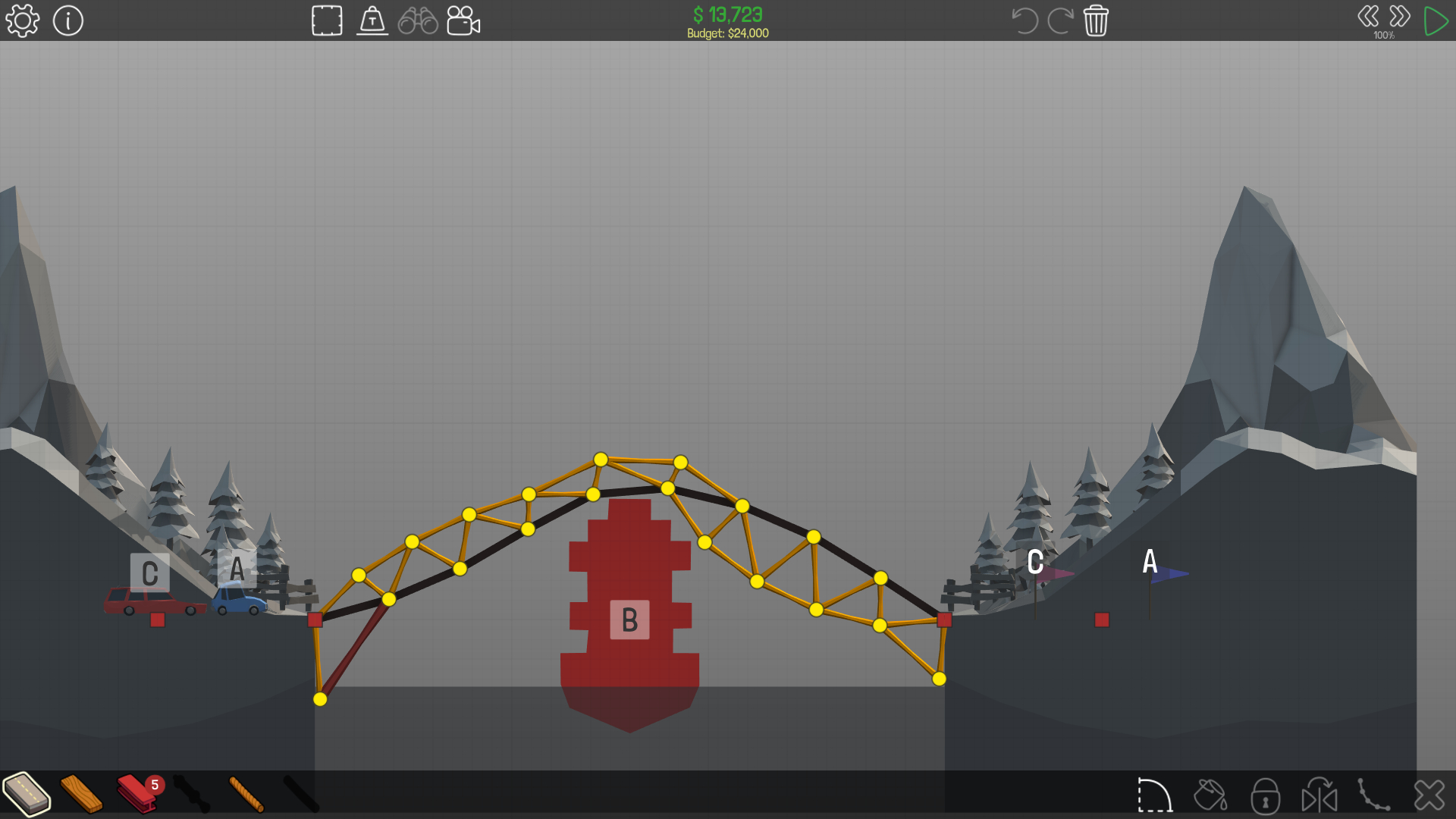 我试了一下,只能超预算过 我这关的船高一点,而且岸上只有一个点 只能用拉索,否则桥后半截会断
