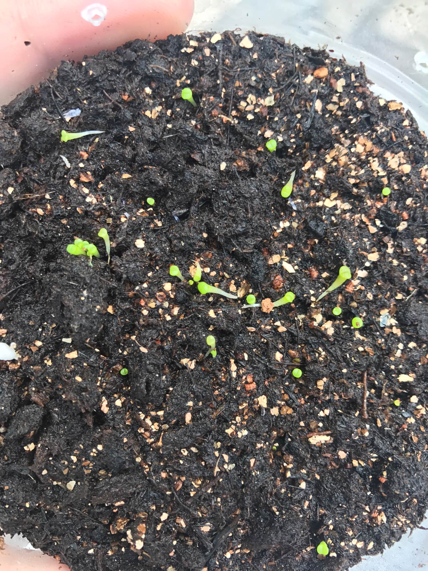 今天小兔子出了10个了,还有一个种子胖胖的,看来它是我第一种出芽率百分之百的种子了!鸽子蛋出来四个了,小豆豆一样,我把覆膜去了,直接隔玻璃晒吧