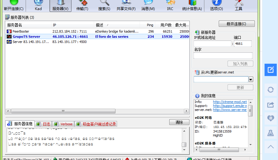 看精品贴里的新手入门教程有提到,“选项”--“服务器”--勾选两个选项“连接到服务器时更新服务器列表”和“连接到其他客户时更新服务器列表”,只有这样才能保持服务器列表随时更新到有效的。不勾选就会越来越少,直到变空。你的问题就是服务器列表里面越变越少,你不知所措,快去找个新手入门贴看看吧,还有记得“移除无响应服务器”的次数尽量填最大,不然只要列表里的服务器无法连接一次你的电骡就会按默认的次数1,把这个服务器清除掉。(其实电骡的很多默认设置都非常坑新手,新手不学入门教程是用不好电骡的)