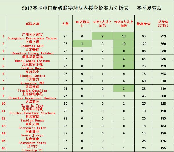 夏转之后与赛季之初有细微变化。身价榜附带球员实力分析,排行榜不代表俱乐部目前在中超积分榜的排名,毕竟还缺少外援和只是生硬的球员数值,只是作为参考!