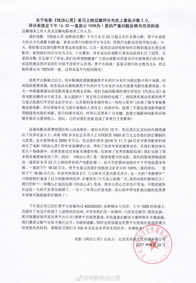 近日(9月22日),一部豆瓣评分仅2.0的电影横空出世,令人叹为观止。据悉,这部名为《纯洁心灵之逐梦演艺圈》的电影由青年导演毕志飞导演,是一部励志题材的喜剧电影,讲述业界的黑暗面。这部电影曾多次定档,不过因为每次档期都撞上了许多大片因此跳票了,不过估计是因为22号并没有什么大片上映,所以这部定档跳票无限循环的电影终于上映了,并被豆瓣观众打出了史诗级差评。这部影片在昨日陷入了全一星的局面,而今日则增加了一部分5星和4星,但也仅仅不到百分之五,两极分化现象比近期上映的一部口碑略低于预期的日本动画电影《烟花》还要严重。因此毫无疑问这是一部被豆瓣影迷视作大烂片的电影,尽管它或许拍摄了12年之久。