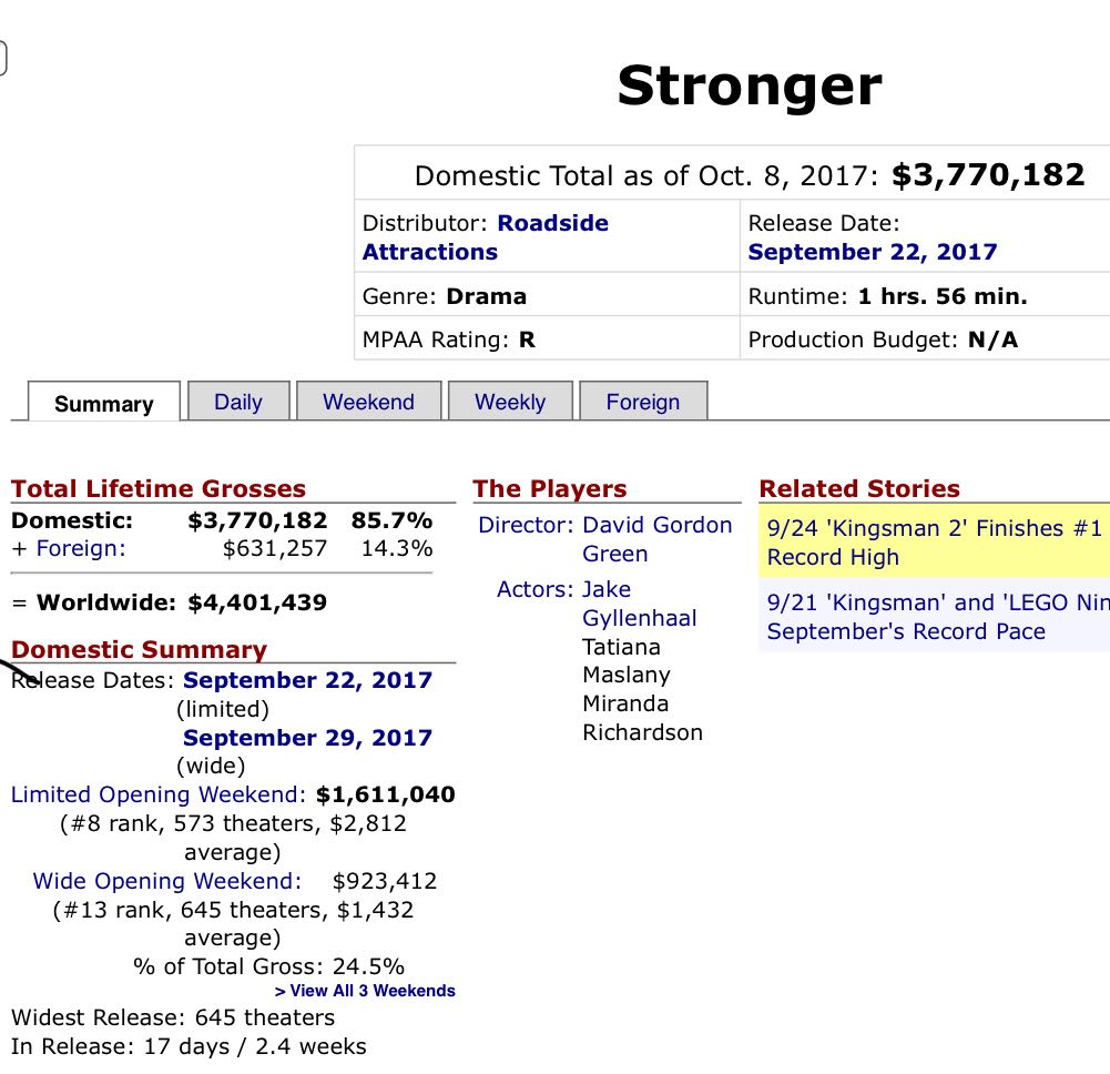 实时票房还没出来,不过Stronger竟然近2小时片长,有点意外