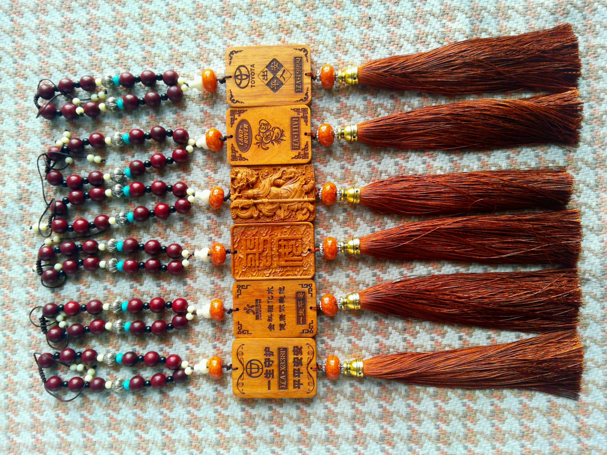 珠子都和牌子是天然檀木的,隔珠是玛瑙珠,很有档次