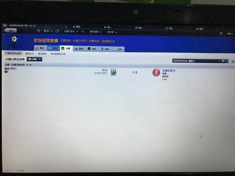 第二轮淘汰赛遭遇联赛死对头,拜仁(我是领头羊,拜仁千年老二),第一回合客场落后一球,回到主场上半场我方中后卫直接红牌被罚下,且被对方进了一球,一直到八十五分钟的时候都梅进球,86分的时我方获得前场任意球,奇迹来了,开出头球破门!扳平比分。进入加时赛,由于少一人作战,中场球员体力都50到60的了,加时赛勉强熬过……进入点球大战……