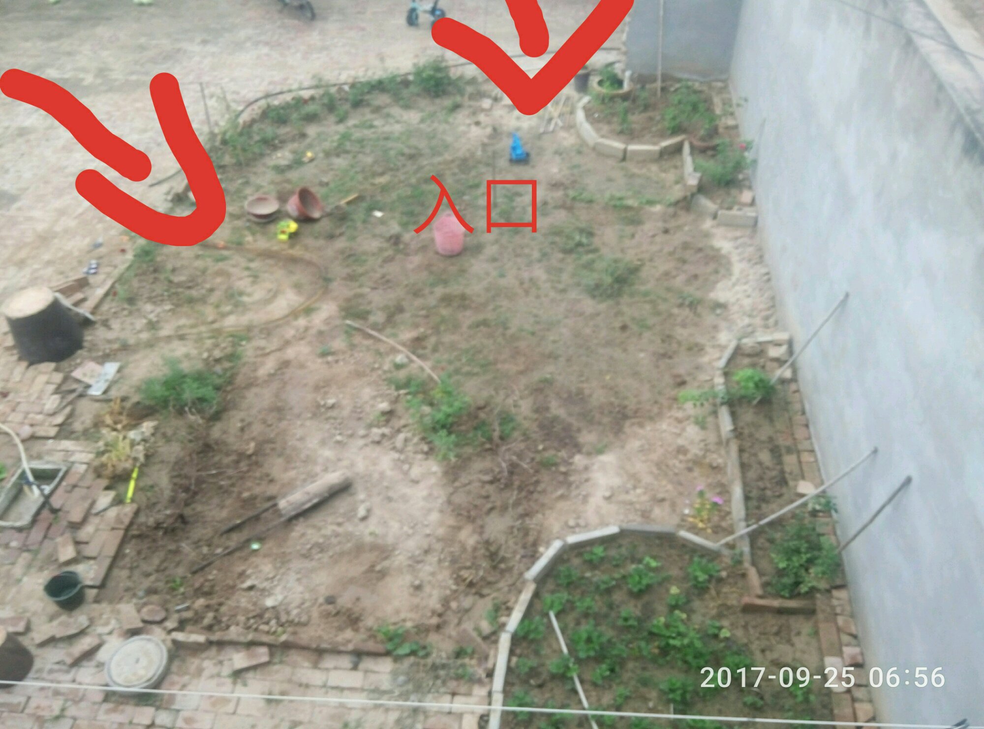 计划想的比较简单,插一圈篱笆,篱笆和墙上爬藤月,再弄几块花草区一个儿童沙滩就好了,北面刚刚种了四颗葡萄,打算搭一个架子做凉亭