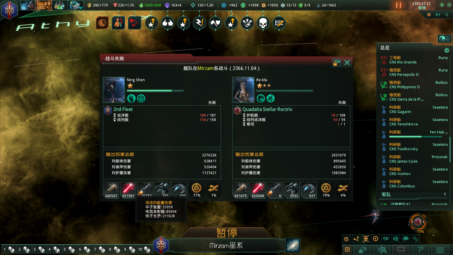而经过观察,发现复兴战列之所以被打爆,并不是因为光矛输出变高导致的,而是因为战斗后期距离拉近,进入了我方动能的射程范围,被动能输出打爆的。