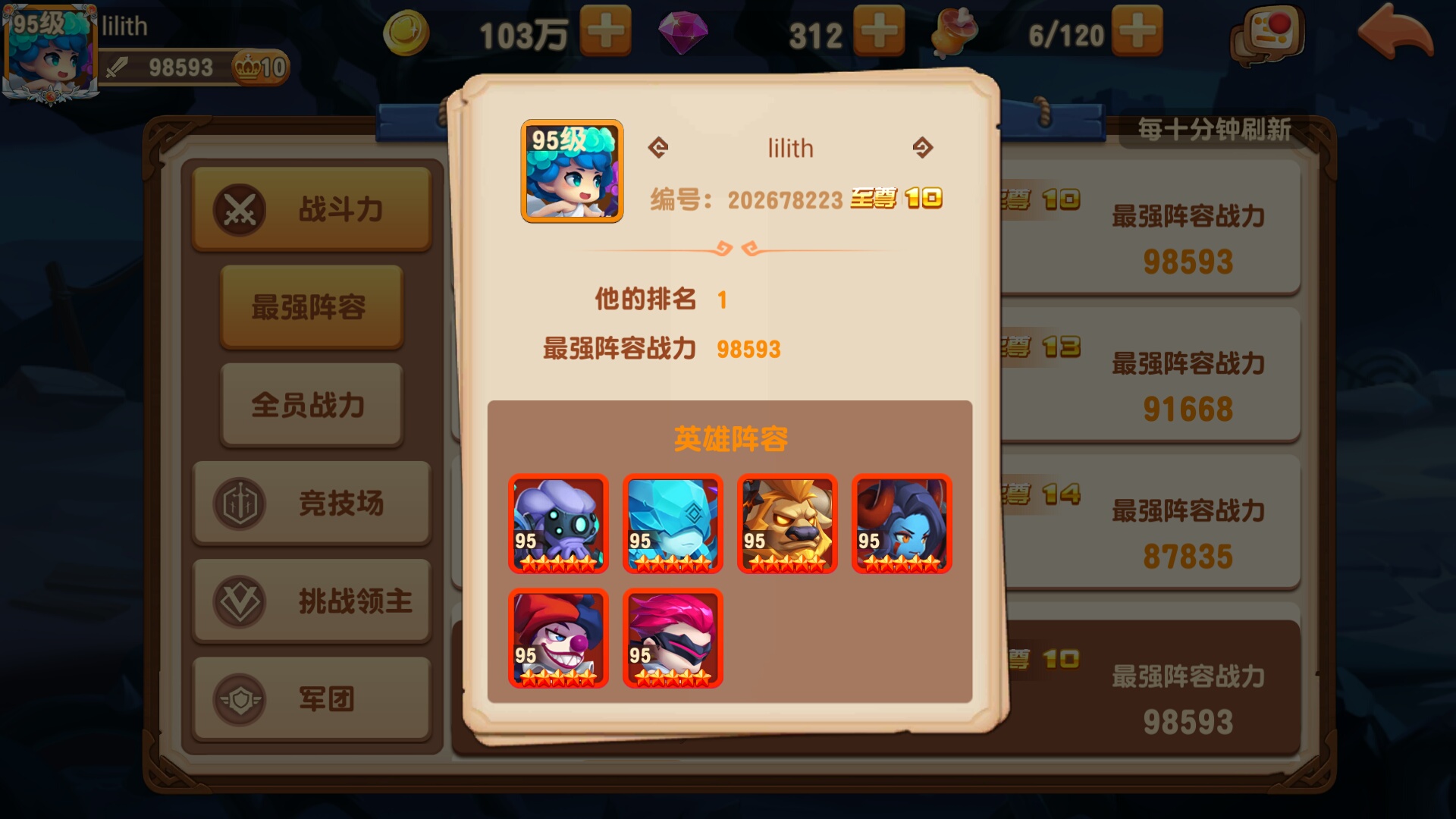 这是我的阵容,不是很强力,用的半年多的时间,从50多名的一支队伍,到前十名的三支队伍,到最后的第一名。
