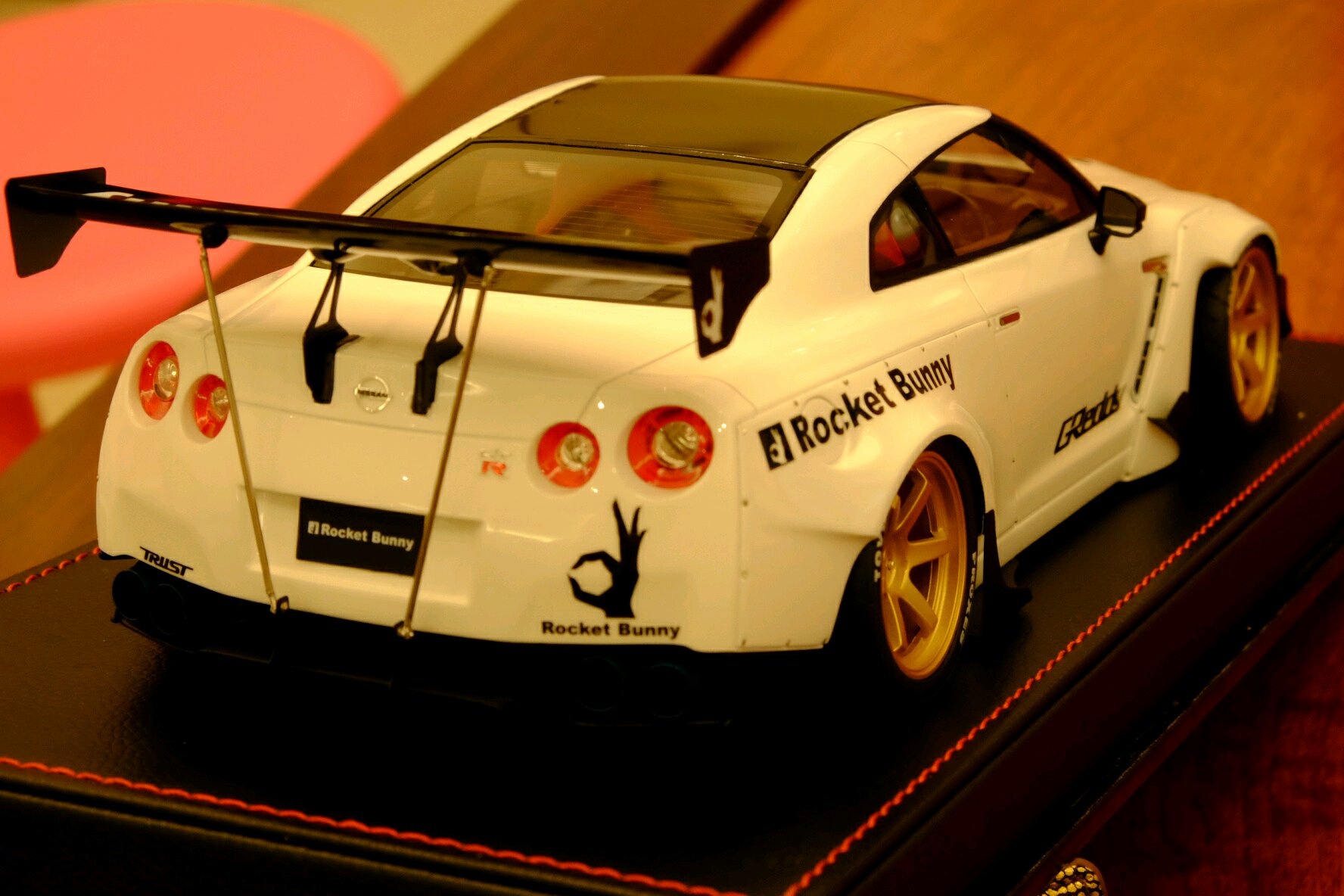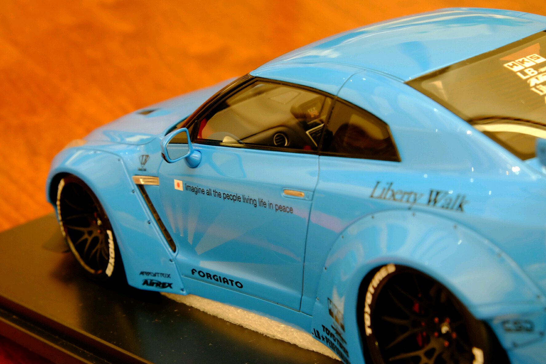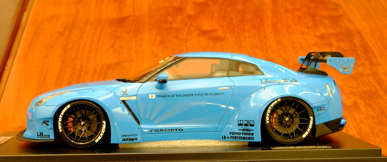 三只极赋视觉冲击力的车款一映入眼帘便令我怦然心动。其实,也读过许多吧友的赏鉴,这次近距离亲见果被这股全球风潮洗礼了。第一只是One model 出品的Liberty Walk改装版本,威名赫赫的尼桑GT-R35,粉蓝色的外观,宽体低趴风范,毫不掩饰炫耀这她的调性。而另一部同为改装版本东瀛战神,白色GT-R35,是由Make up 出品的IDEA系列火箭兔Rocket Bunny ,从头至脚的一身行头就是要突兀、要冲击、要挑衅,绝对是霸气宣泄。太被吸引住了。最后一台,也是我认为此三者中最足味视觉冲击感的Liberty Walk 出品的限量10部的宽体版粉蓝色小牛P610,尖锐地摧枯拉朽席卷一切。此外,这款车拿到了一个非常好的号码,还要实实在在地感谢此方宝地的故交,一位模界的博禹老友啦![[哈哈]](/static/emoticons/u54c8u54c8.png)