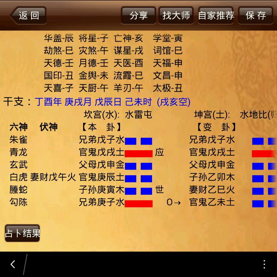 父母申金,日月生,为新房子!应爻空,可能一直没有可售信息,连问的人都极少!辰土间爻临日月冲有动的迹象(此句不参与讨论)!应该是让中介卖的!财伏鬼下,子孙休囚,难倒房子耗财,还是卦主最近手头紧而出售。另外问下卦主之前是否有在未成交的过程中损财了?看卦,二爻不动,这个房子真的很难卖!明年上半年有希望!貌似楼主是高手,献丑了!
