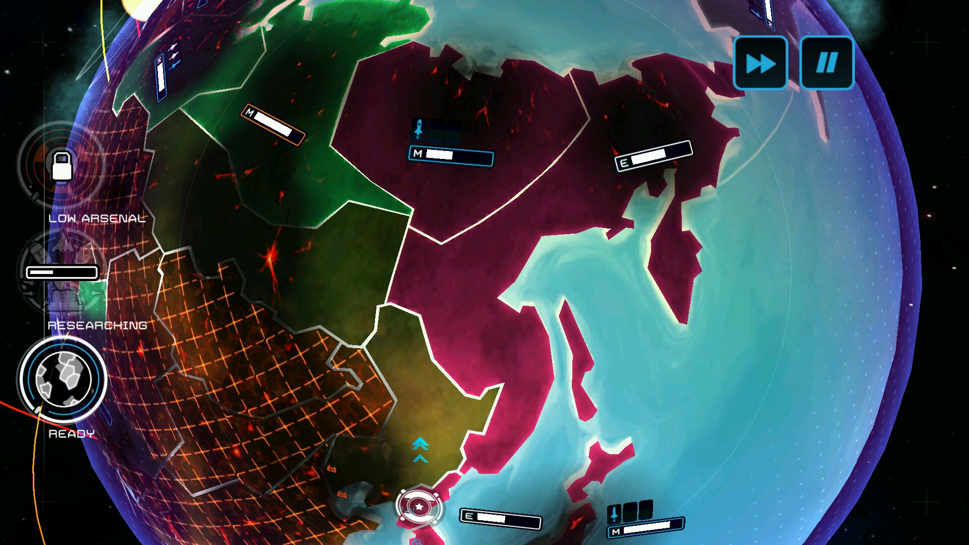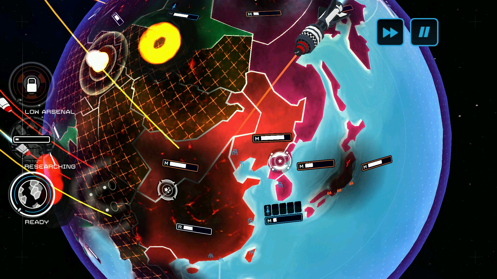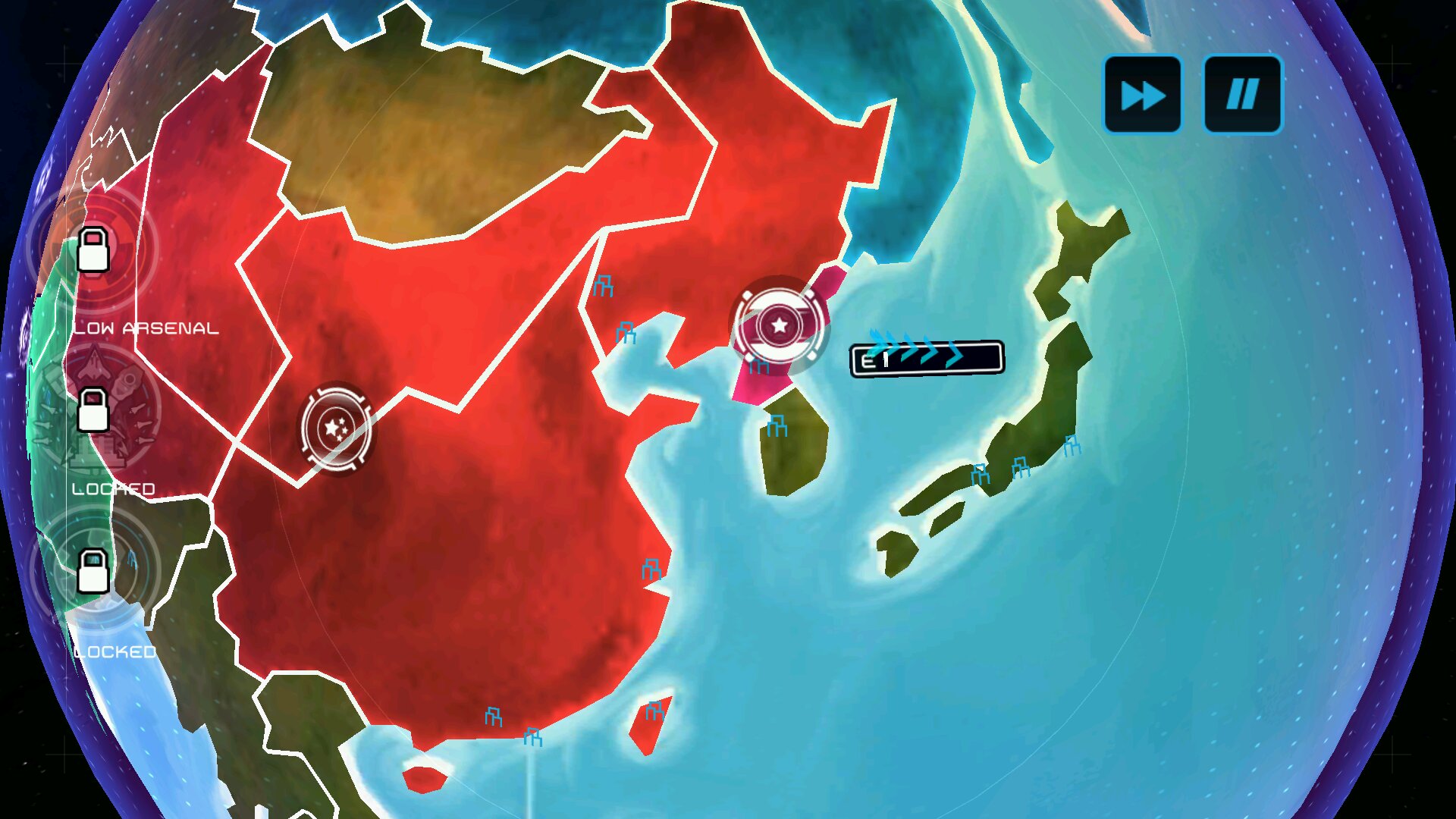 首先说明lz我玩的是英文版1.3的fs手游。官方中文版的广告植入太坑了(只是多了一个没啥用的超音速飞弹),所以没下载玩。开局选朝鲜,10个有核国家,按下骷髅头。超武左甜圈右奶糖