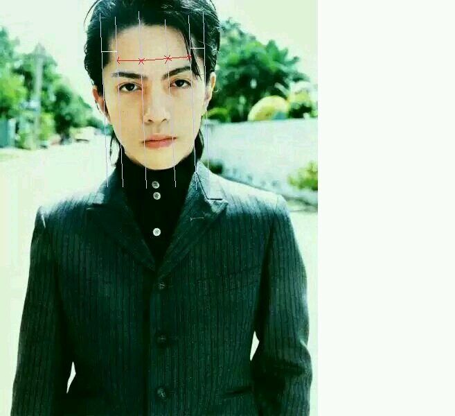 五眼准则不符,因为海大爷眼睛大且长,眼睛长度超过了面宽等于五倍眼长的准则(这是打破常规的其中一点啦)。但海大爷眼距、眼长、鼻翼宽度相等,显得五官不会太过局促也不会太过分散