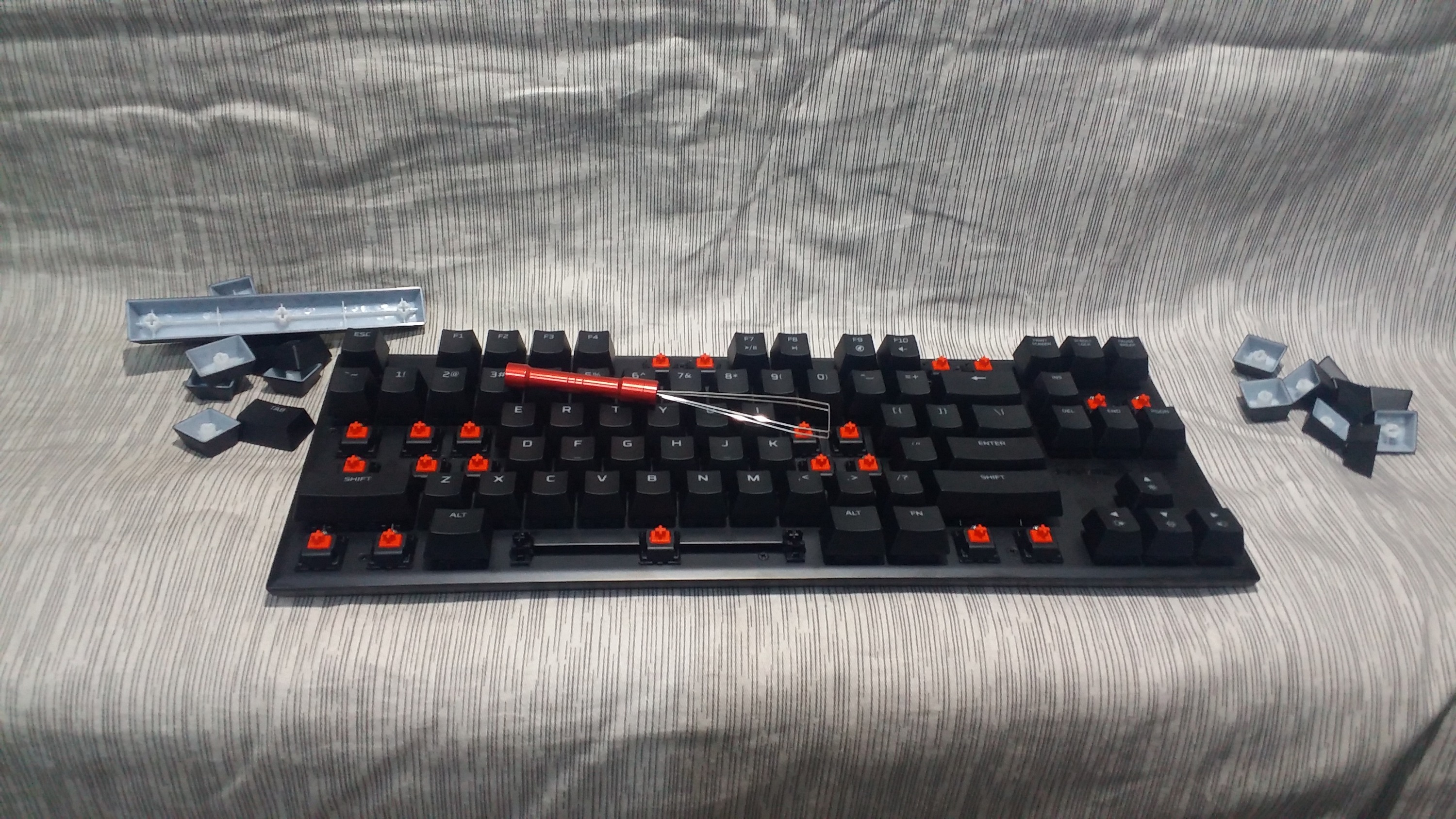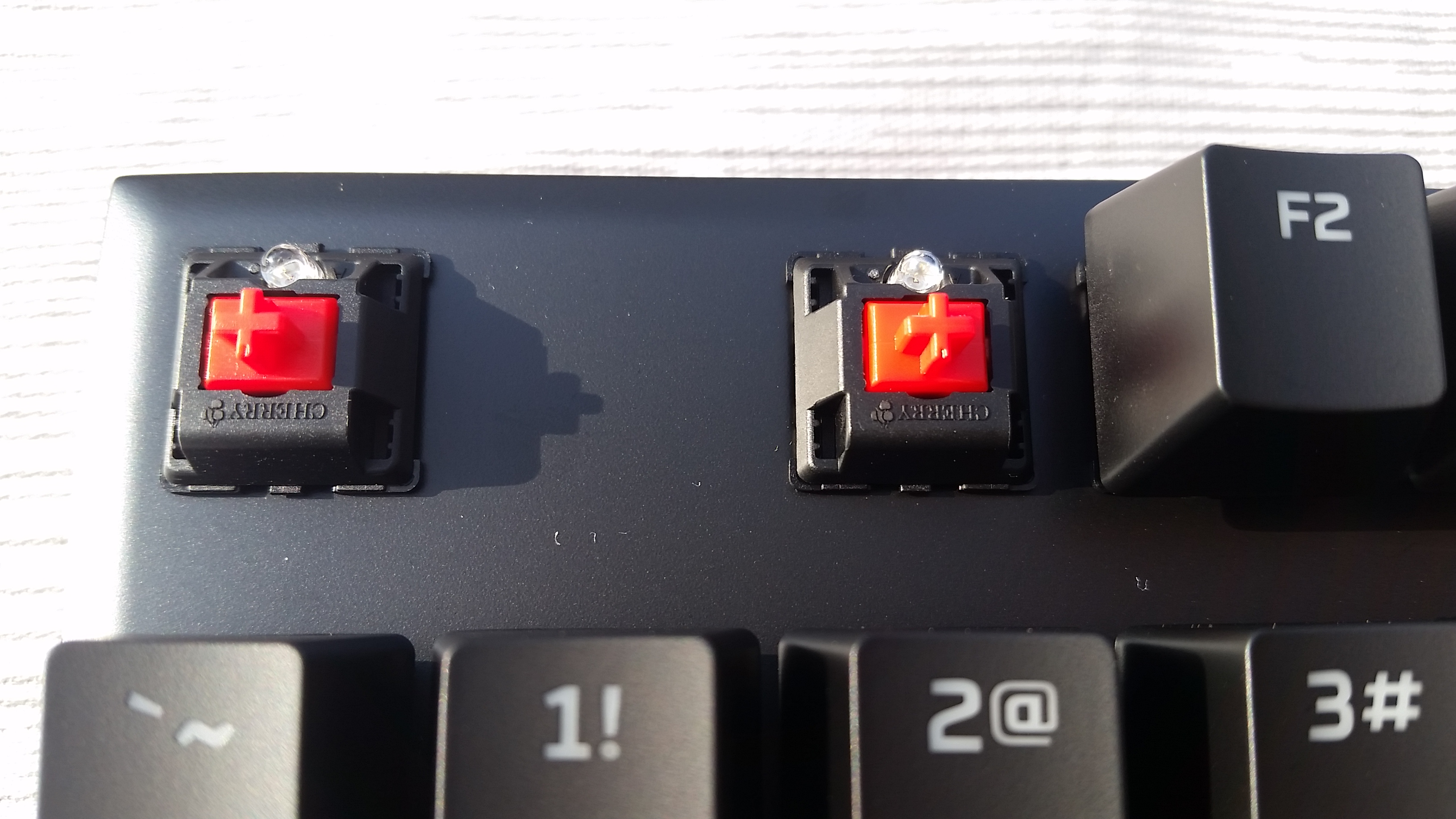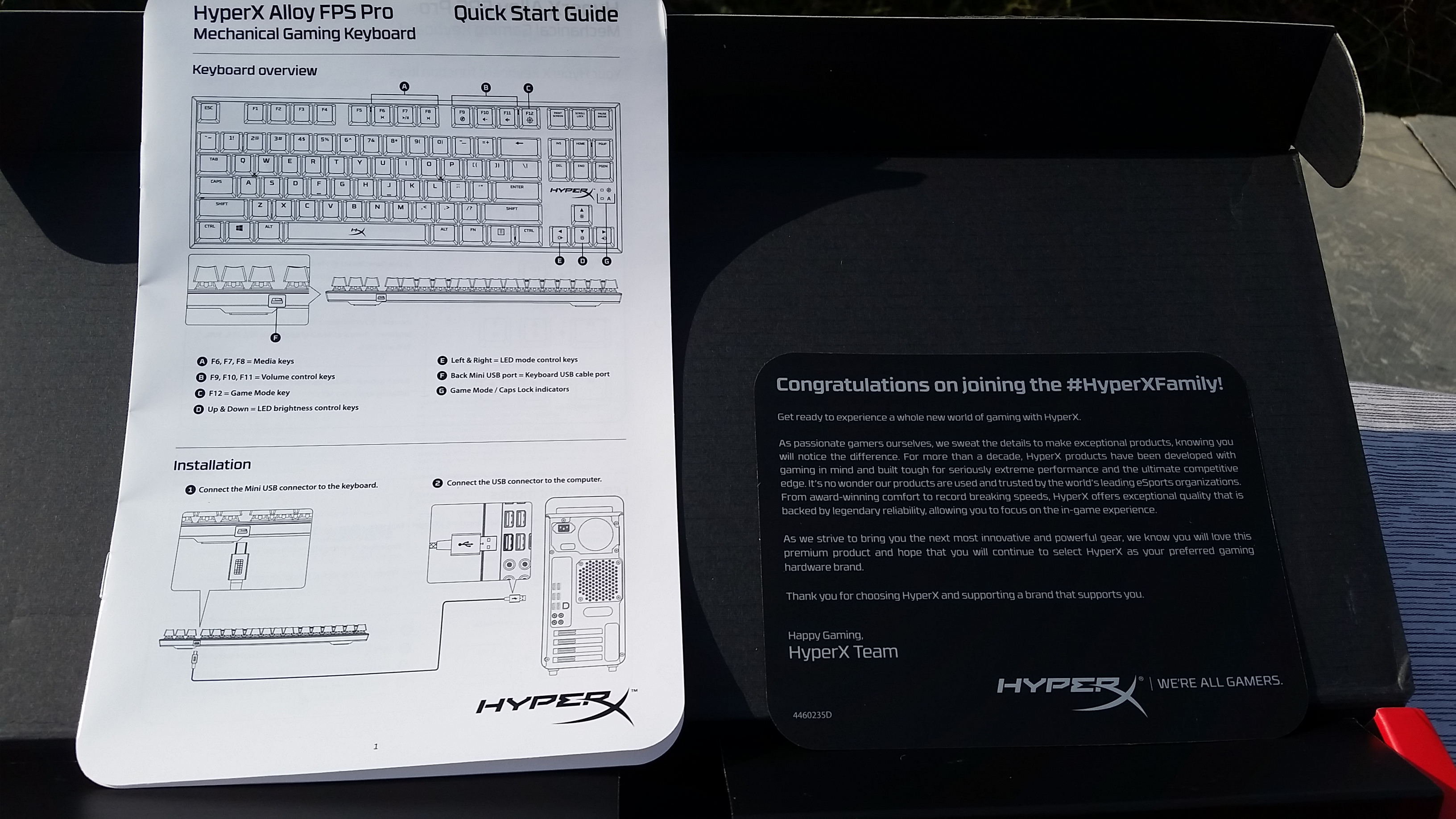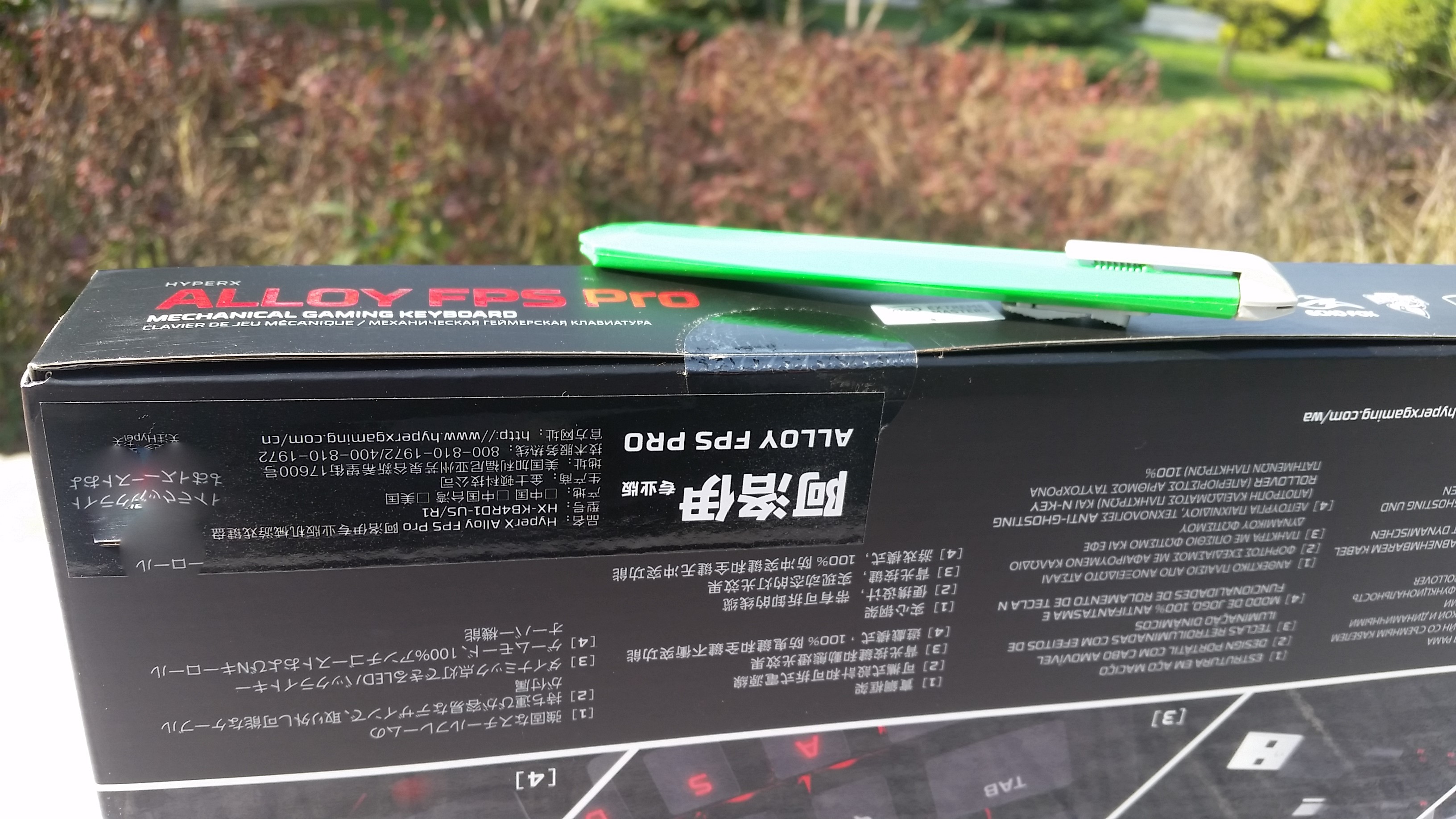 拿到键盘后便去了附近的一个公园,趁着下午阳光条件不错完成了第一次户外开箱,第一次外拍,拍的不好各位看官海涵。包装正面介绍了这把键盘的基本信息:外观渲染图,原厂cherry原产红轴,US配列等,左侧还用多国语言专门注明了这把键盘是专为FPS设计的87配列游戏键盘。