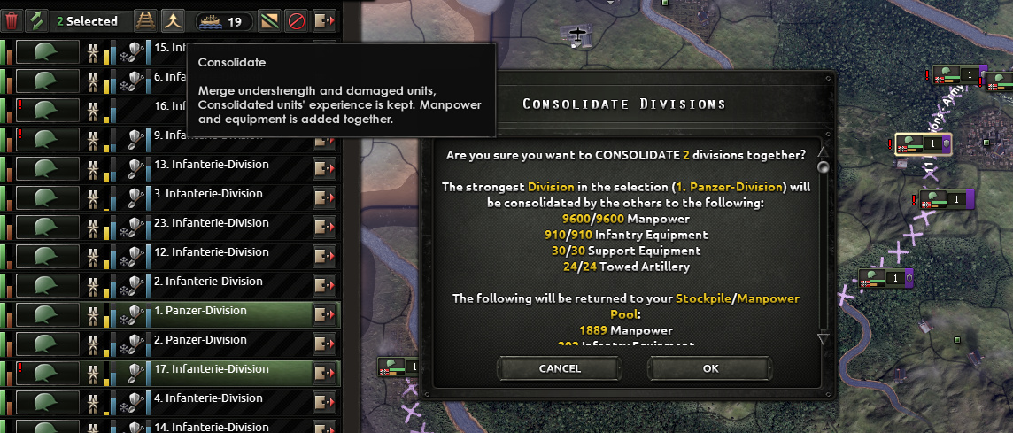有时在艰苦的战斗之后,或是被包围导致你有大量的低hp步兵单位。有时候你希望他们能立即满血复活而不是慢慢补充增援。新的**DLC**会允许你合并部队,将多个步兵师合并成几个满编的单位(或是接近满编)。 通常来说,编制更加不全的单位会被合并至相对满编的单位中,人力以及装备会全部一起转移过去。 这个系统还可以同时处理多个步兵师,讲他们合并成尽量多的满编步兵师。