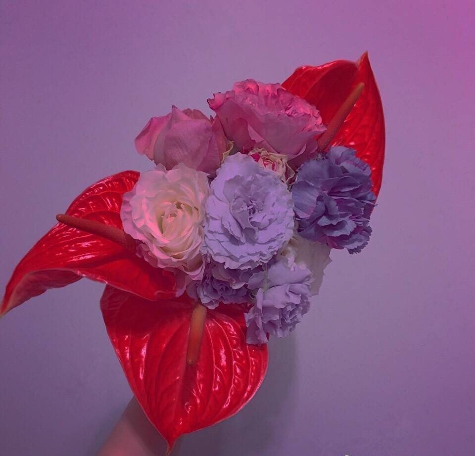 想问下红掌配花中粉色那两朵是什么花