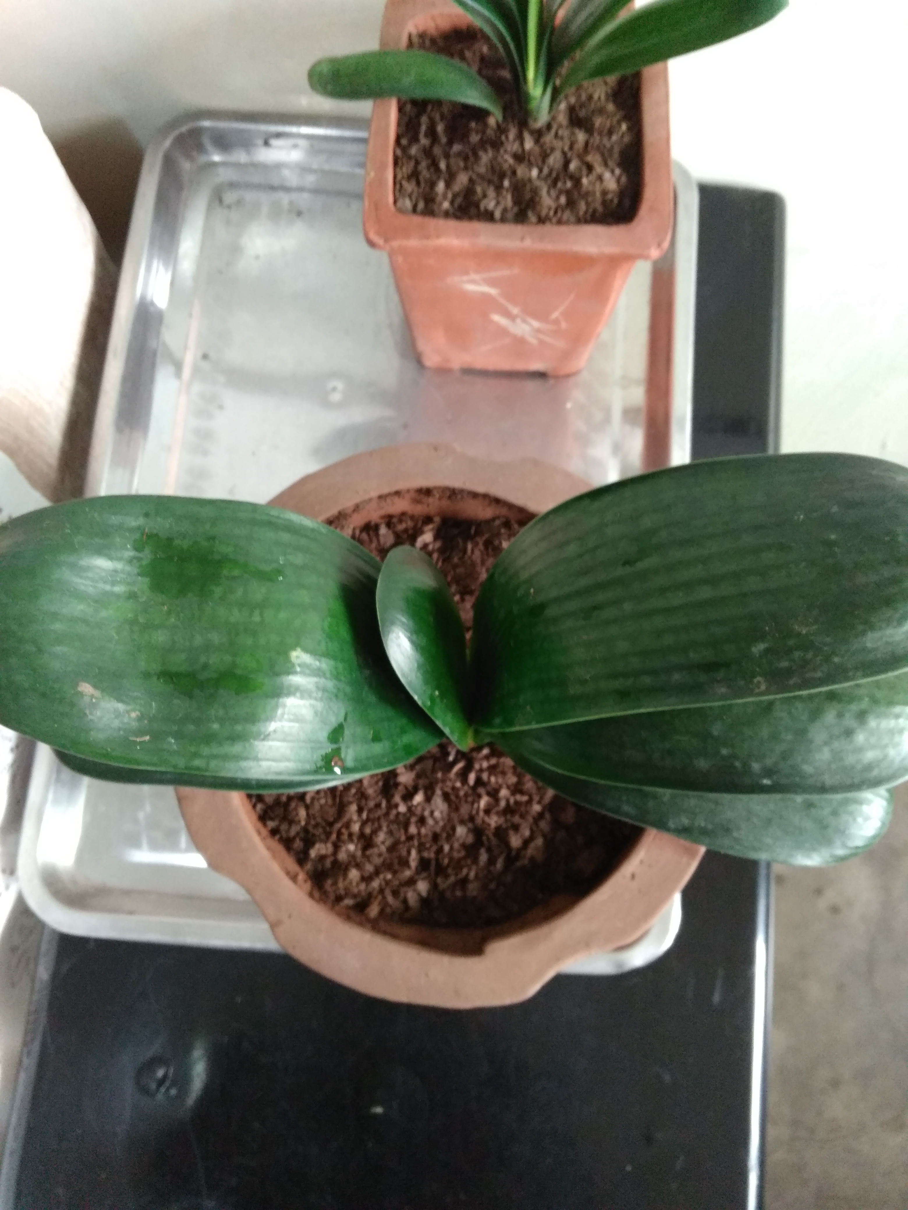 新手,在网上淘了一棵小苗,还未到货时,正巧在集市上看到有卖兰的,买了一棵,20元,说是和尚,我也不懂,和网上淘来的一起种上了,大家看看是什么品种?(后面那样是淘宝的油匠)