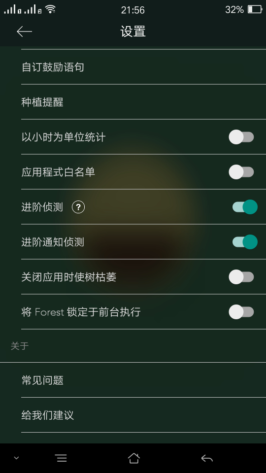 开启存储权限会自动弹出一个手机设置界面,给forest权限,设置关闭应用时使树枯萎,开启进阶侦测