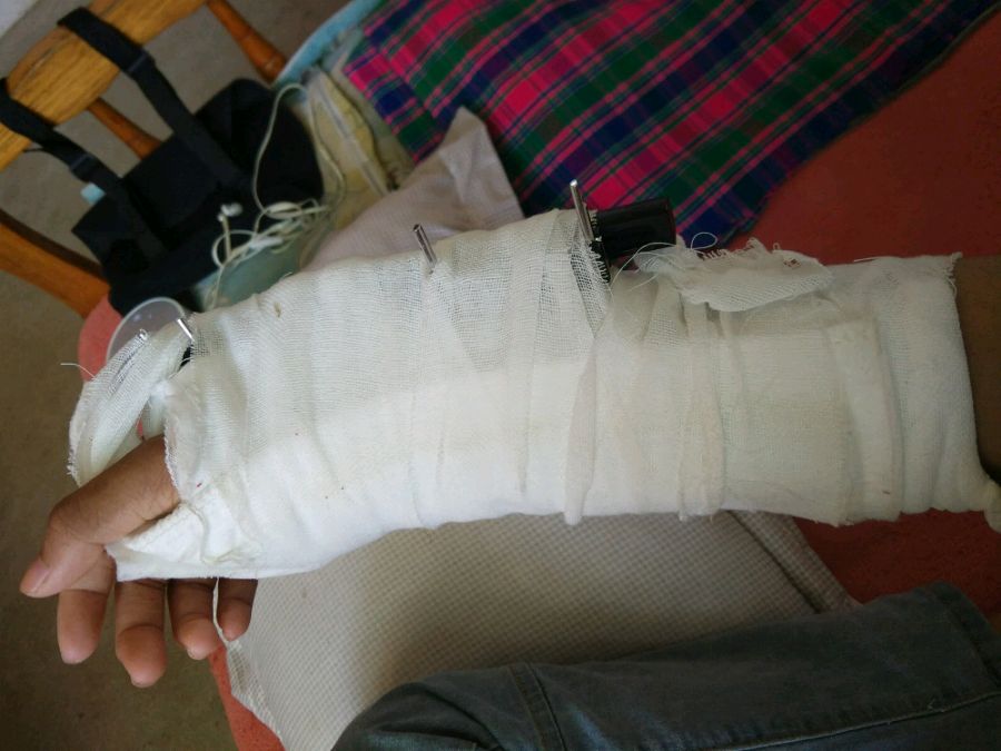 我是上个月13号做的外固定支架手术,我呢?是手腕部这里桡骨骨折所以就装了一个外固定支架,然后呢是前天拆的。