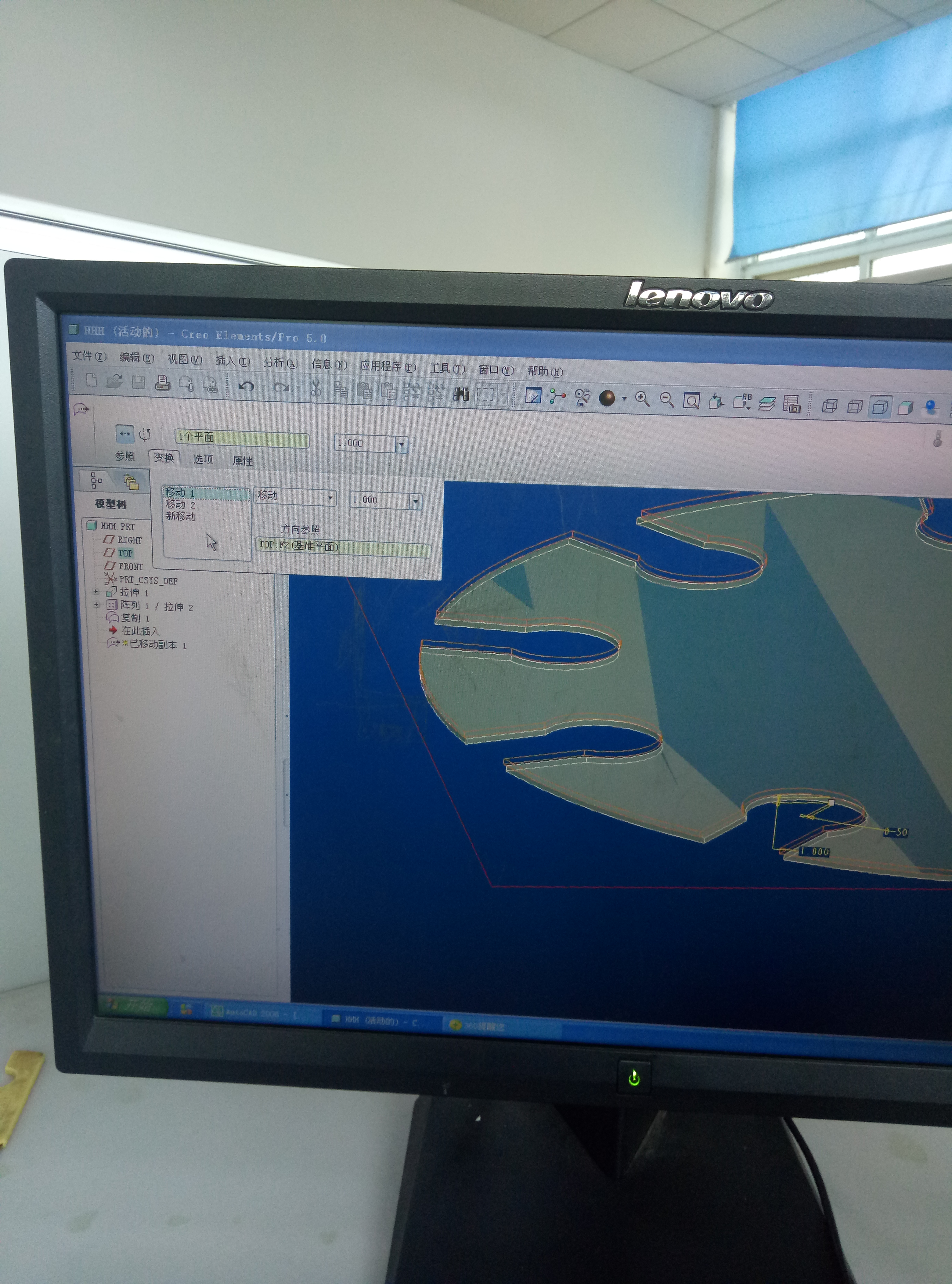 就是先选上步拉伸的薄片面组,点击“复制”,再点“粘贴”,出现对话框,先移动再添加旋转(一定要在此对话框中一次性完成)就是一复合运动了。