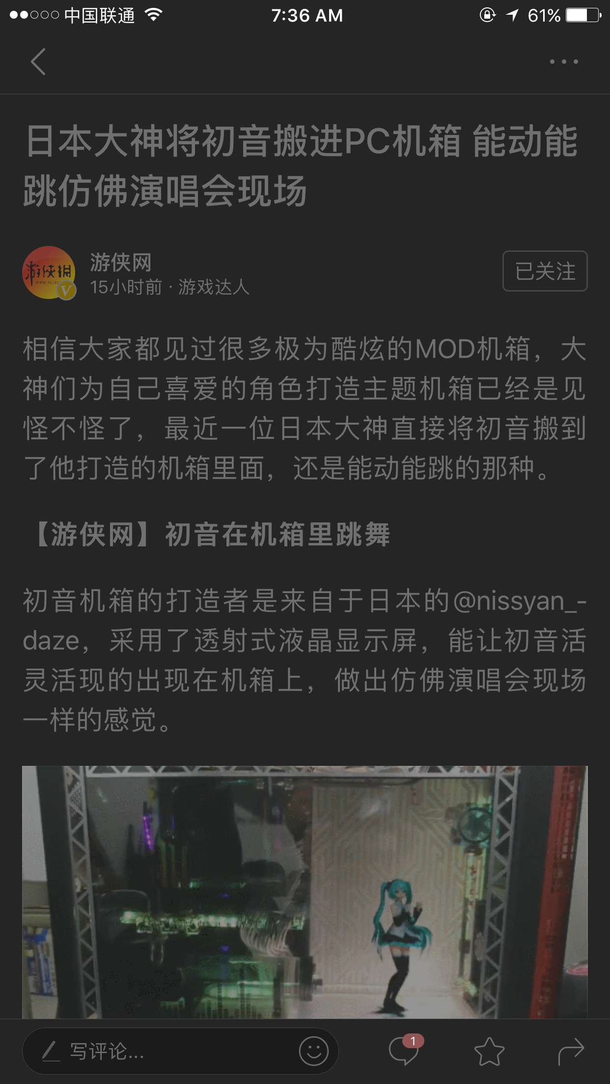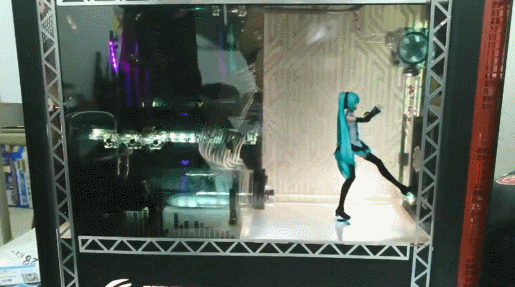 机箱前是一块显示器的液晶板拆开就是一块透明的玻璃,然后机箱侧板安照显示液晶板去切割,然后放装上,在电脑内编辑好一段视频循环播放就行了,内机箱内部灯光处理一下完成看上去就有初音在机箱内跳舞啦