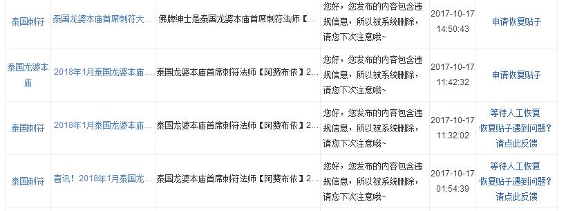 本人仔细阅读了置顶的帖子的发帖规范要求。同时也仔细审核了自己的帖子。帖子中不涉及违禁违规的信息。但一直被系统自动删除,从本月15日开始申诉,到今天都没有恢复。请管理们给予恢复,十分感谢。申请恢复【泰国刺符吧】的帖子。这个帖子对我很重要。