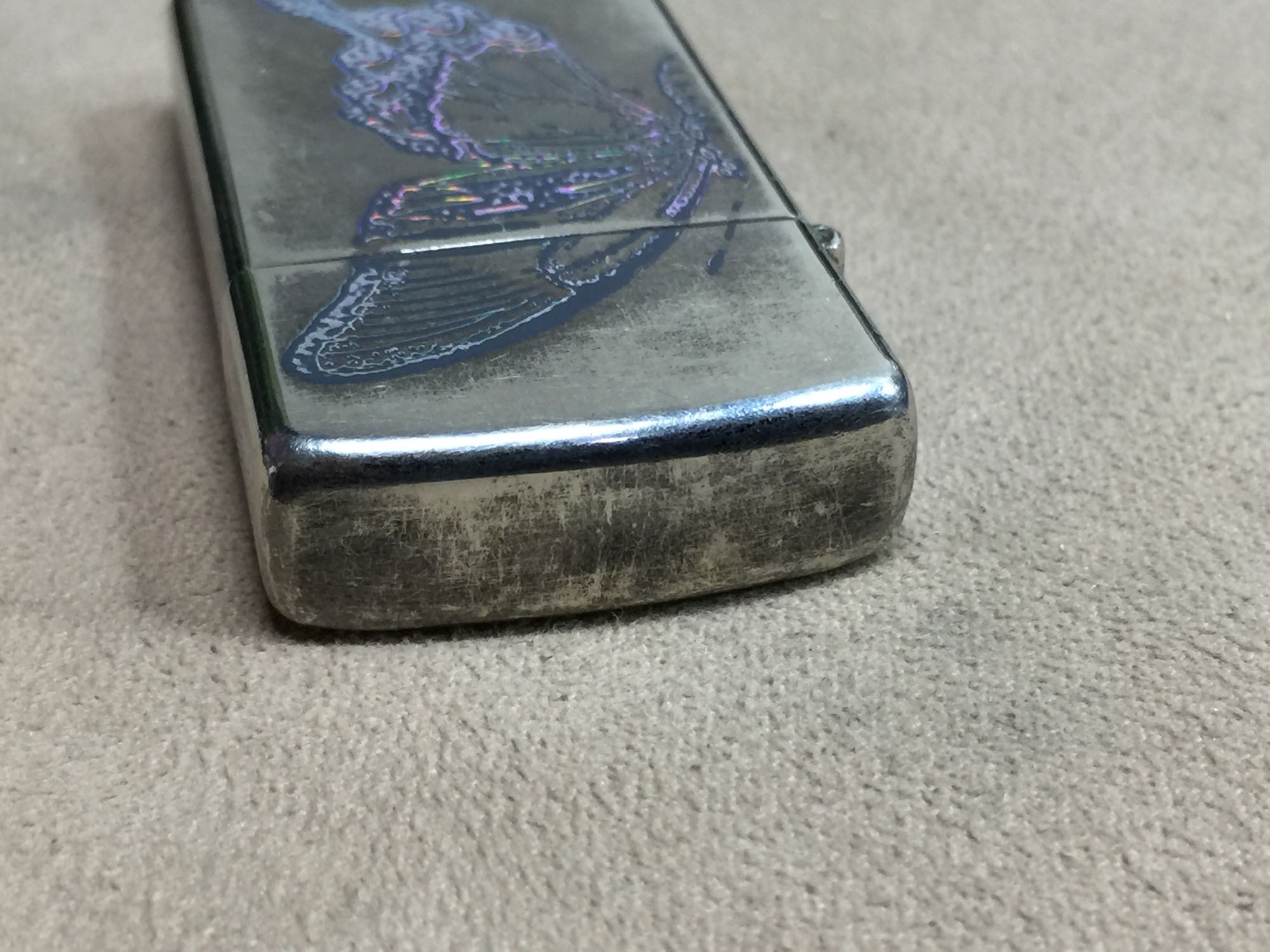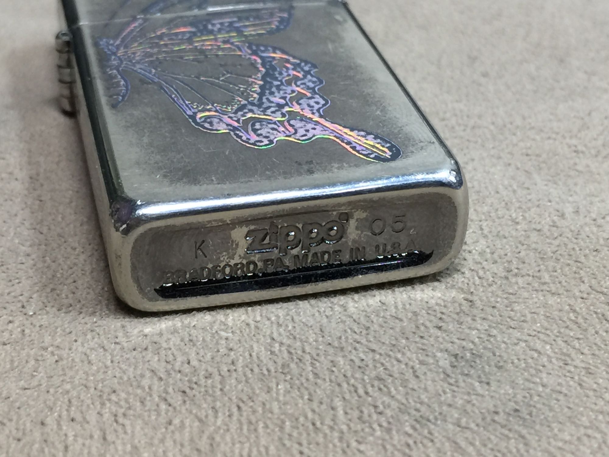 【详细描述】二手2005年 黑冰蝶翼窄机。机身黑冰镀层较多磨损,蝶翼图案部分磨损,边角小磕微距拍出,定义差品。铰链正常,原配05G内胆打火不错,无包装。