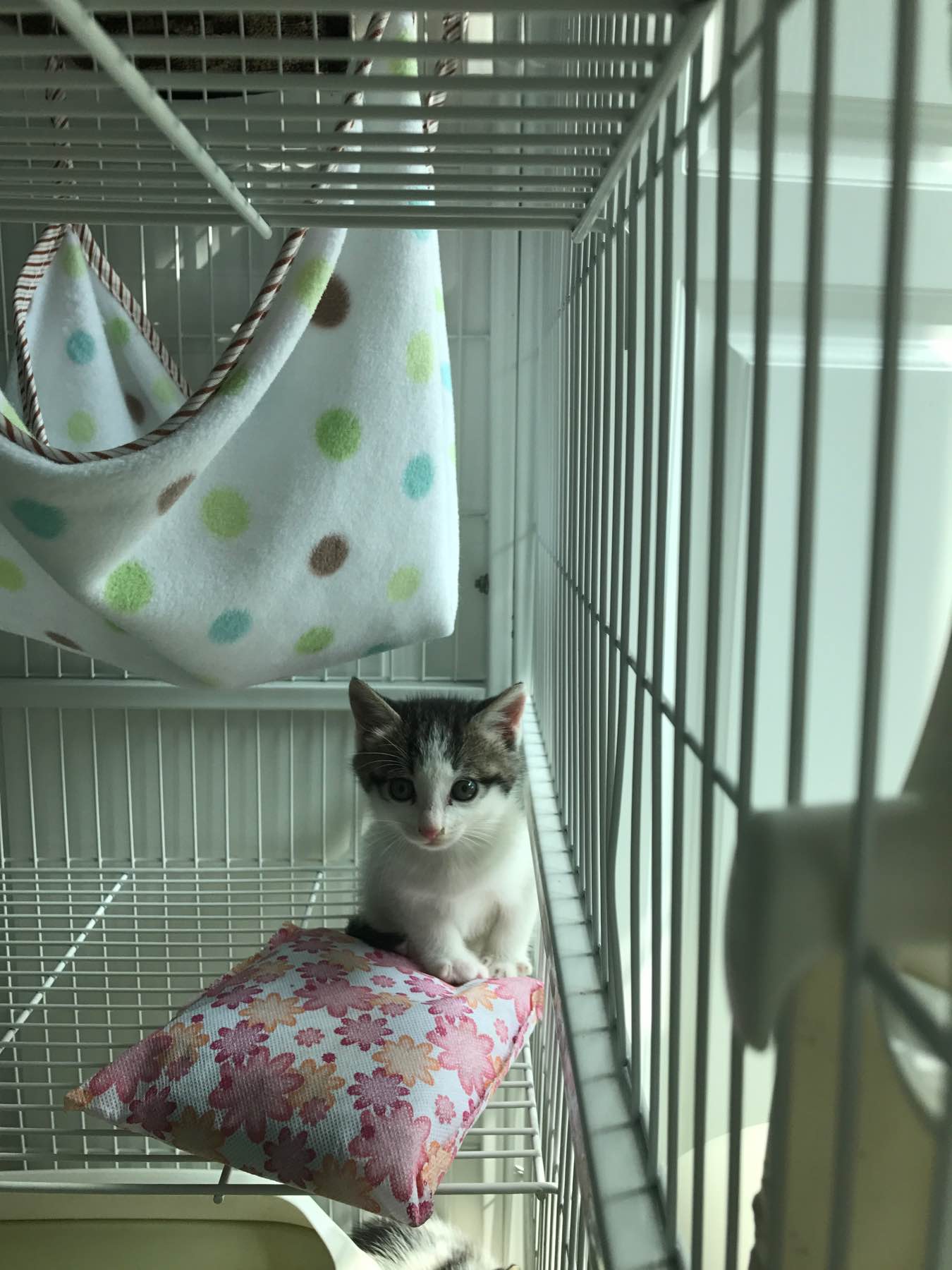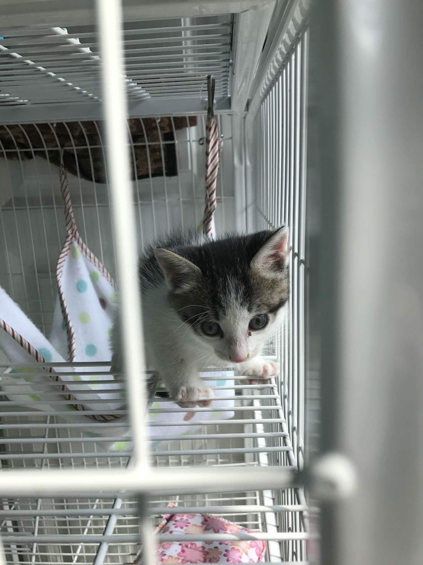 楼主,恕我多嘴,小猫在笼子的话最好垫个细网或垫子。刚买笼子时我猫也这么小 第一次放进去玩 它从隔层向下跳的时候,脚卡在缝里 整个猫倒挂在隔层边 怎么挣扎都下不来,看着脚好痛,幸好我就在旁边及时把它摘下来,不然后果不堪设想啊