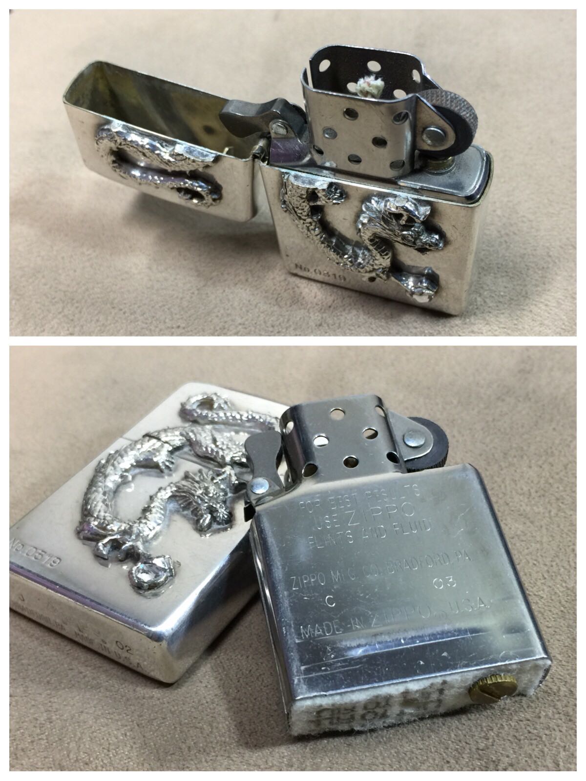 【具体描述】二手2002年10月镀银机 大贴章 龙戏珠,限量编号0319。机身正常使用擦痕划痕,边角磕碰微距拍出,定义差品。铰链正常,原配03C内胆打火强,无包装。