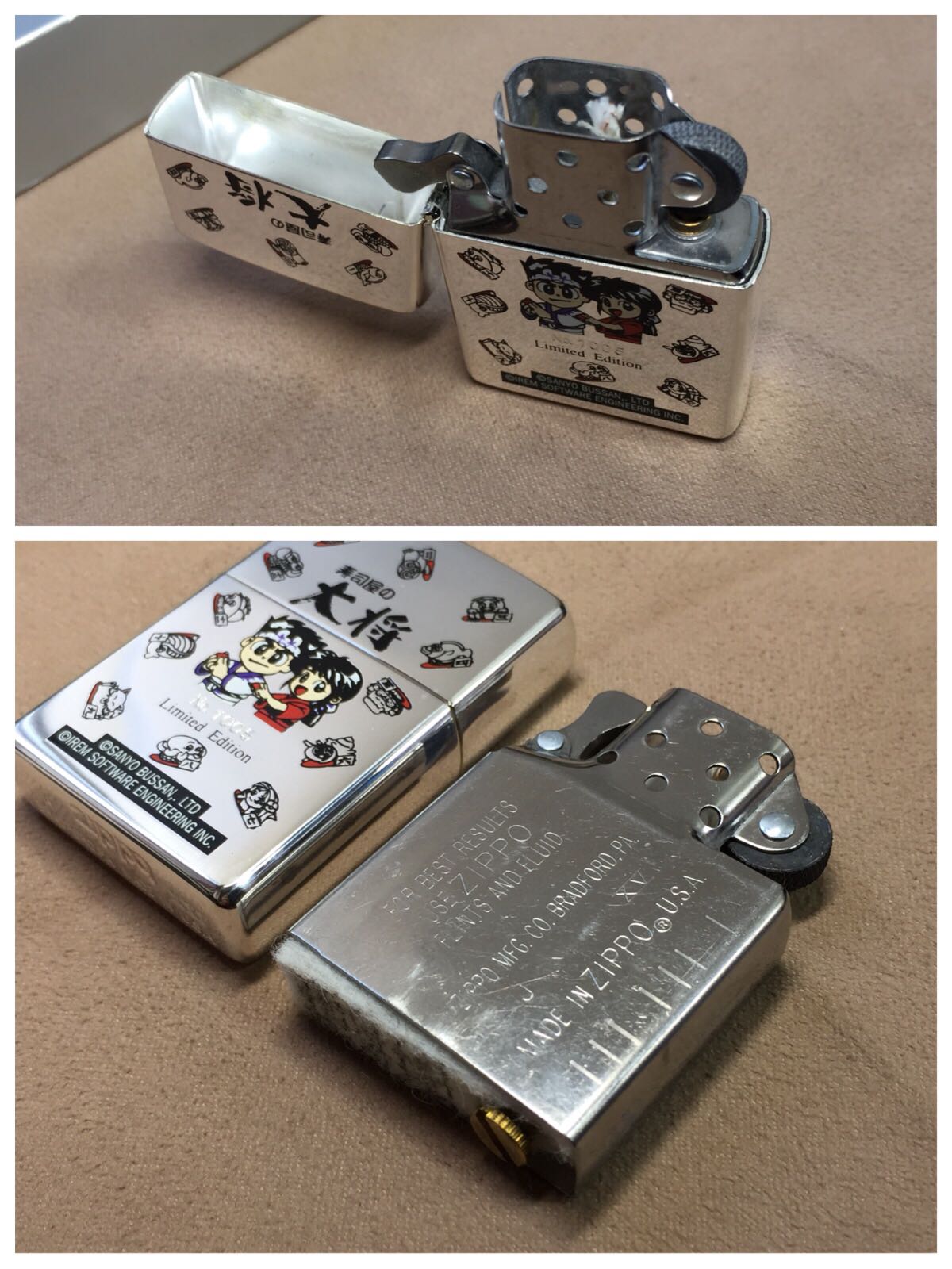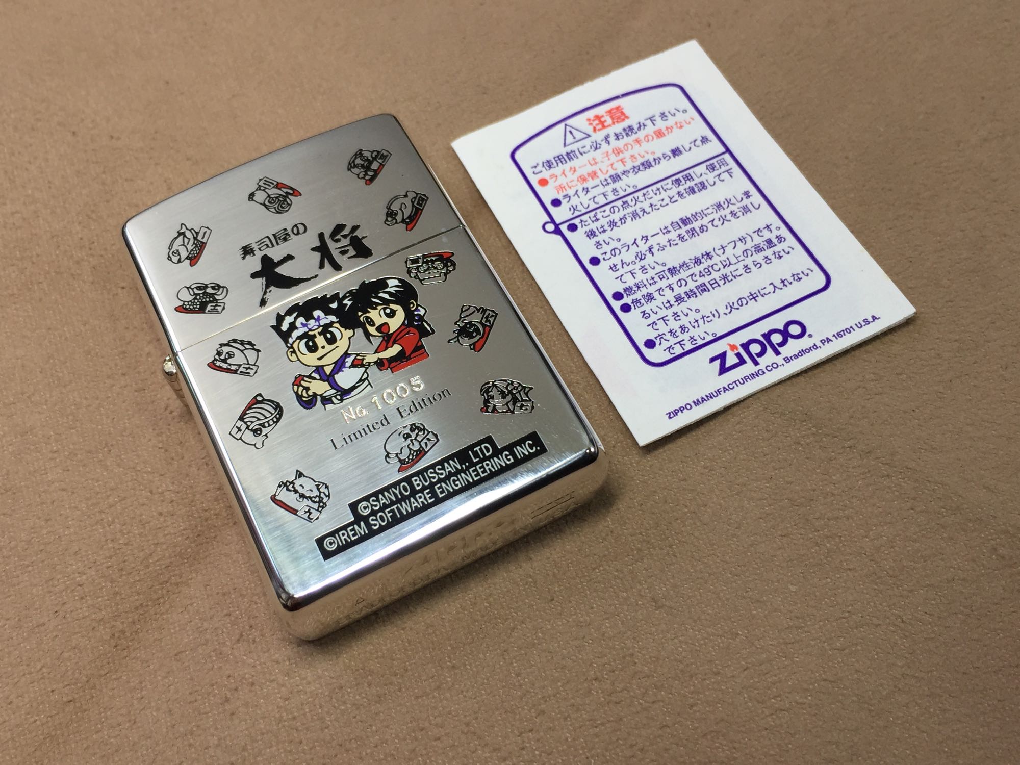 【详细描述】全新2000年1月 寿司屋 限量镀银机 烟盒套装,发行价1万日元,本套限量号1005。镀银蚀刻填漆工艺,该机因火石风化(已处理)火石粉末溢出导致机身镀层有些磨损擦痕(高光拍出,正常角度不明显)镀银层局部轻微氧化,定义全新一般品。原配全新99J内胆,原盒原说。配套烟盒为铝合金材质,超轻超薄,手感极佳~