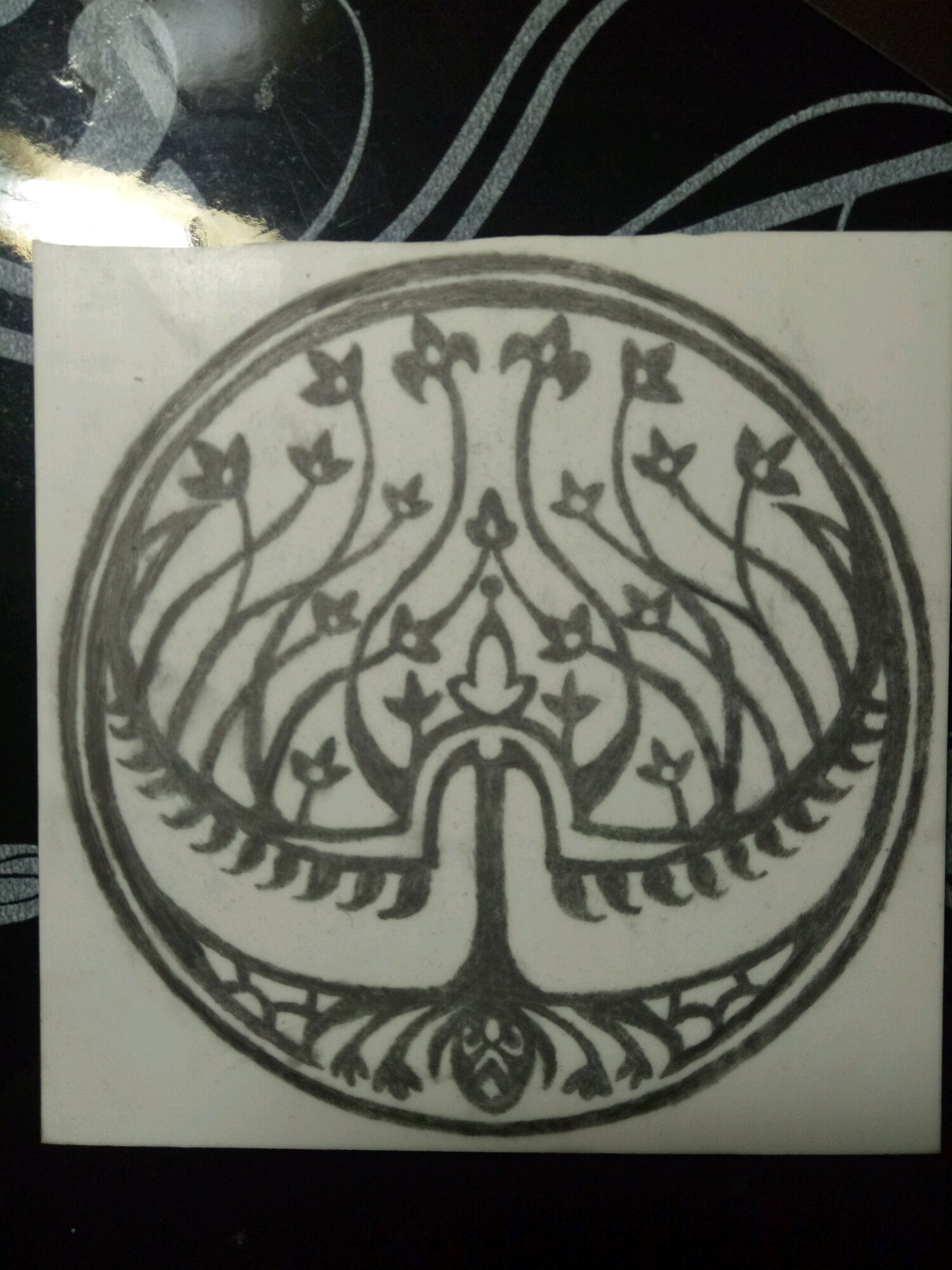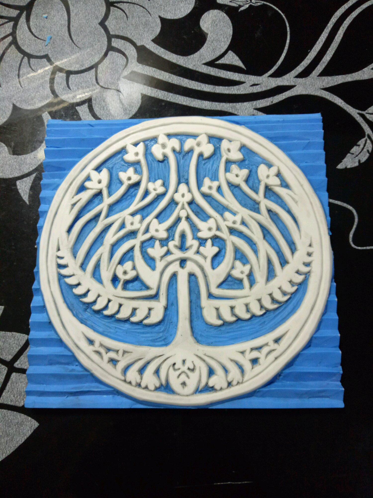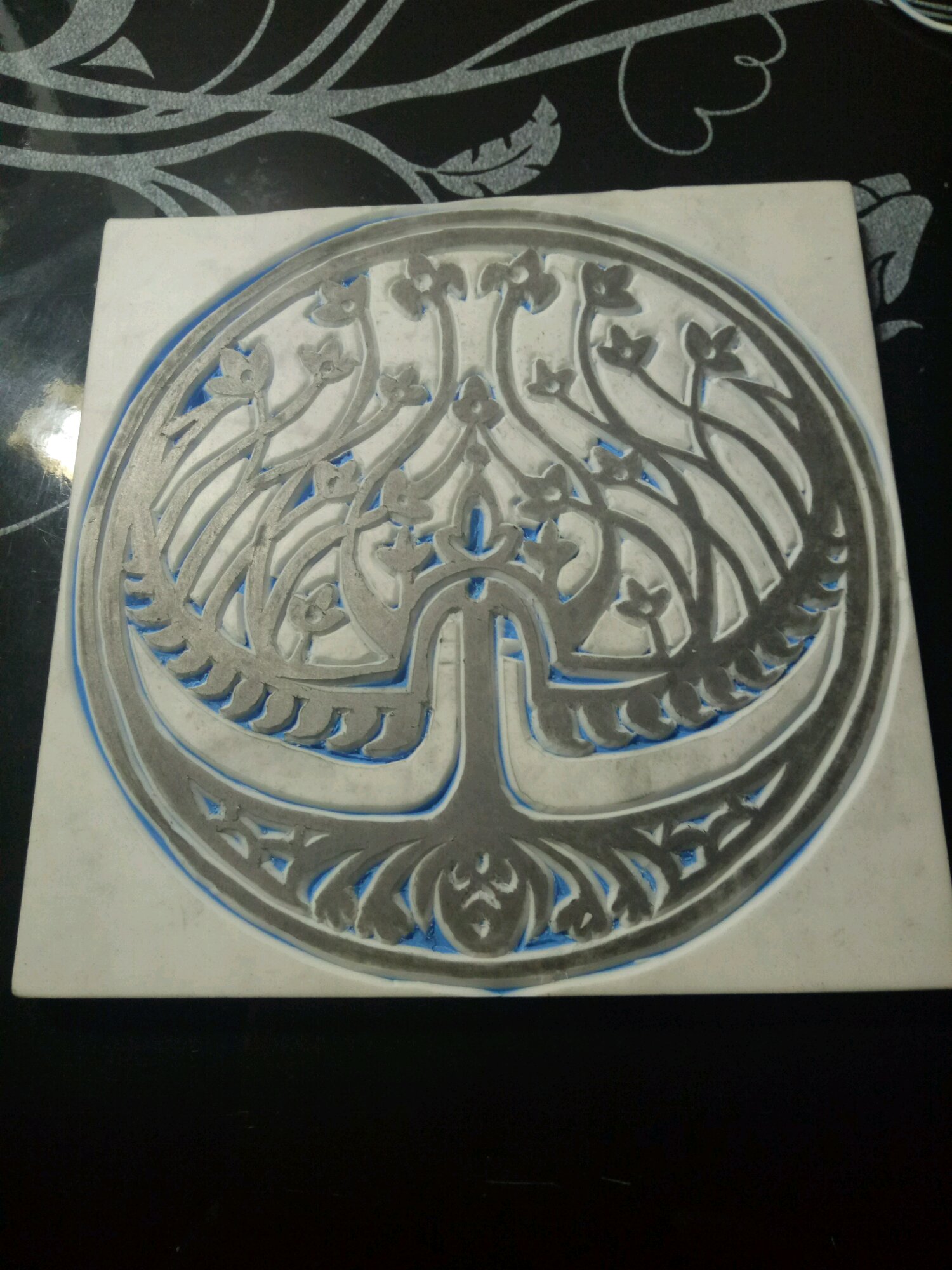 经过3个晚上的努力,刻好三分之二了,明天把白的地方磨平就彻底完成了。目前是这样的,已经能看出图案都刻好了