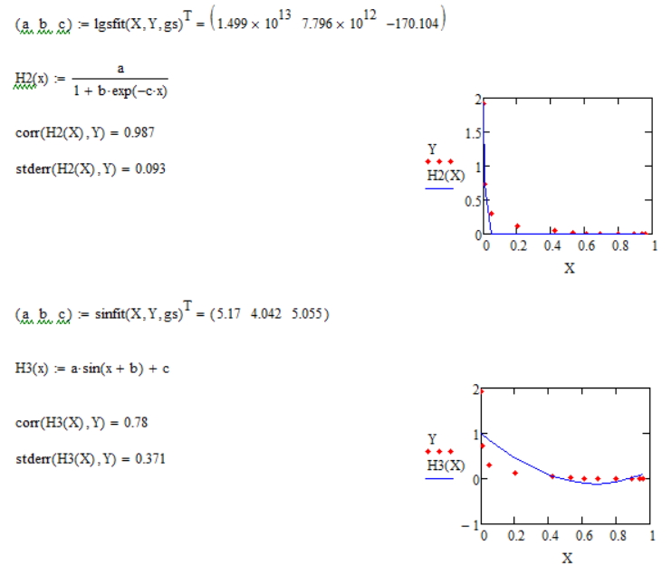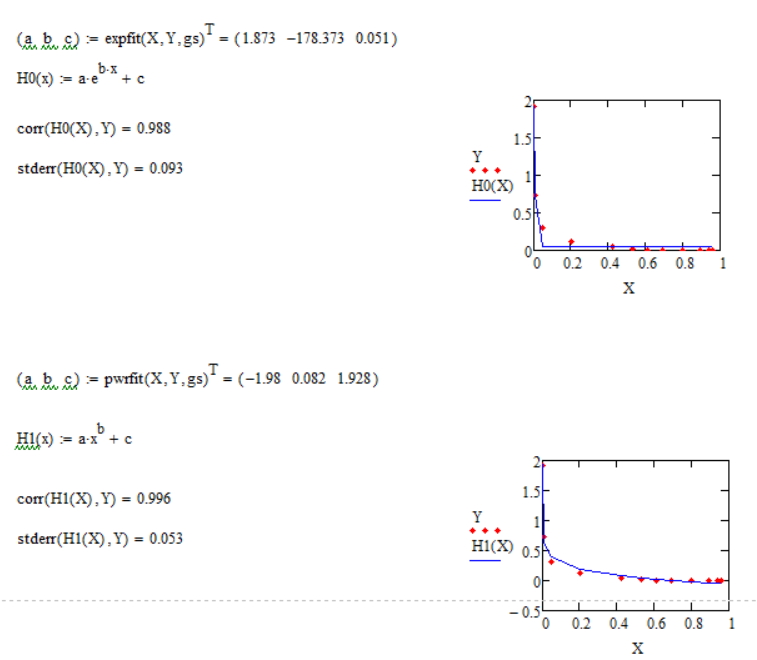 吧友向日葵yyhappy在https://tieba.baidu.com/p/5330600586中提到了曲线拟合的问题。其实,MC的帮助中就有这方面的内容。遗憾的是,各个函数的帮助分散,读起来并不方便。长者张培忠老师的《MathCAD学步随笔》中对曲线拟合有专门的章节讲述,很容易看懂。衷心感谢张老师。MC的专门的曲线拟合函数有6个,到底哪一个更贴近散点数据,得事先估计一下,用笨办法一个一个地试验,效率不佳。我借用吧友向日葵yyhappy的数据,把曲线拟合玩了一遍。现在把我的全部练习的内容都粘贴在下面。内中的谬误,还请诸位不吝指教。谢谢。