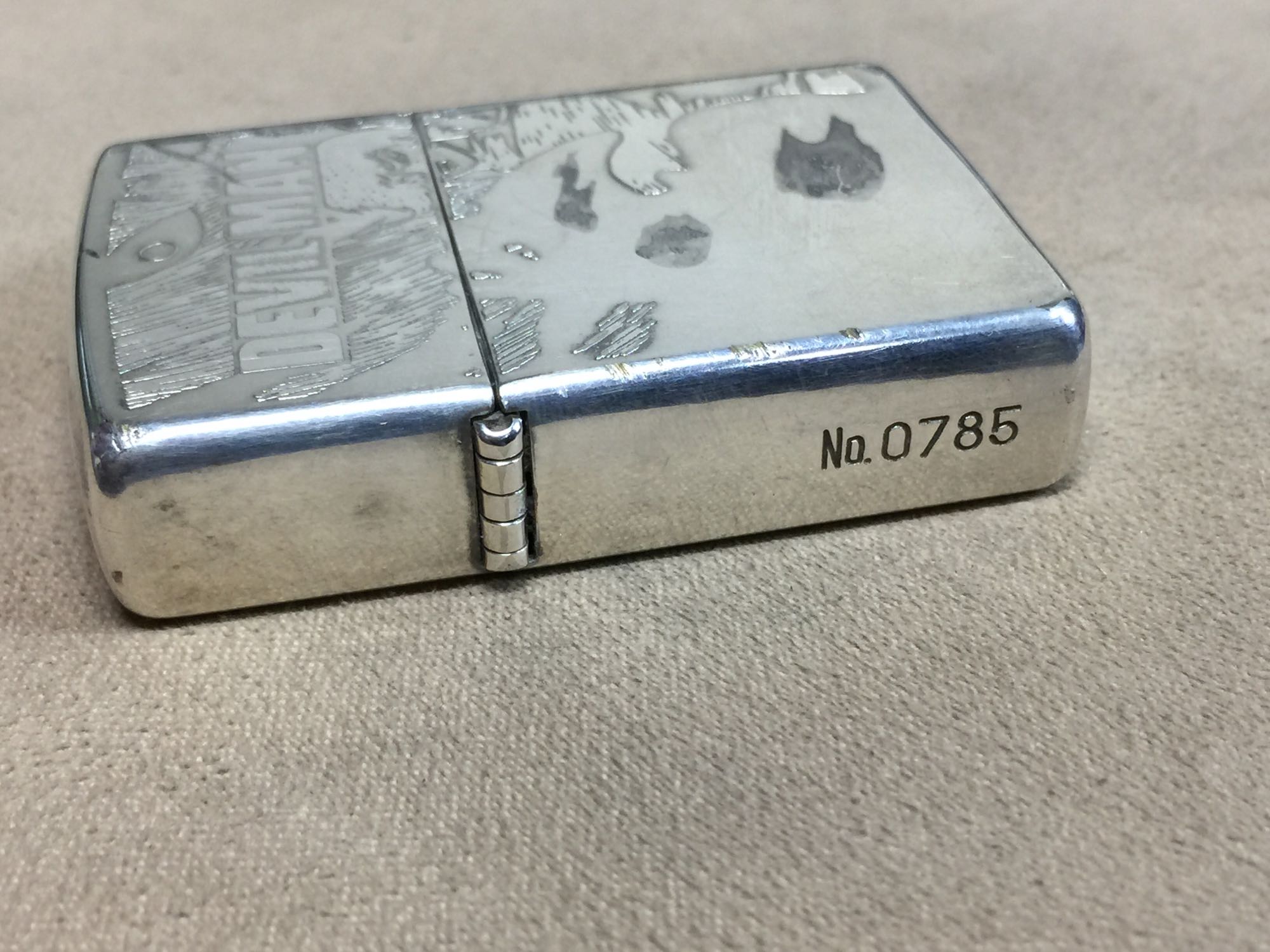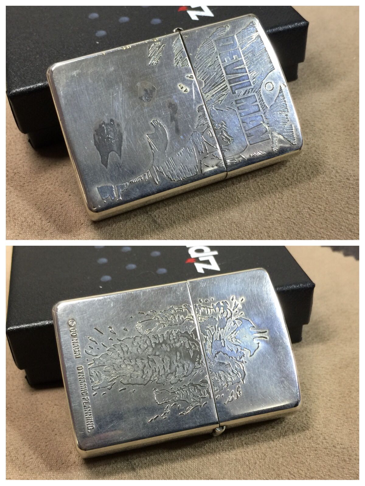 【具体描述】二手1996年12月 双面浮雕 镀银恶魔人 限量编号0785。该机掉章,镀银层正常使用擦痕氧化浅划痕,边角磕碰微距拍出,定义差品。铰链正常,原配97D内胆打火强,无包装。