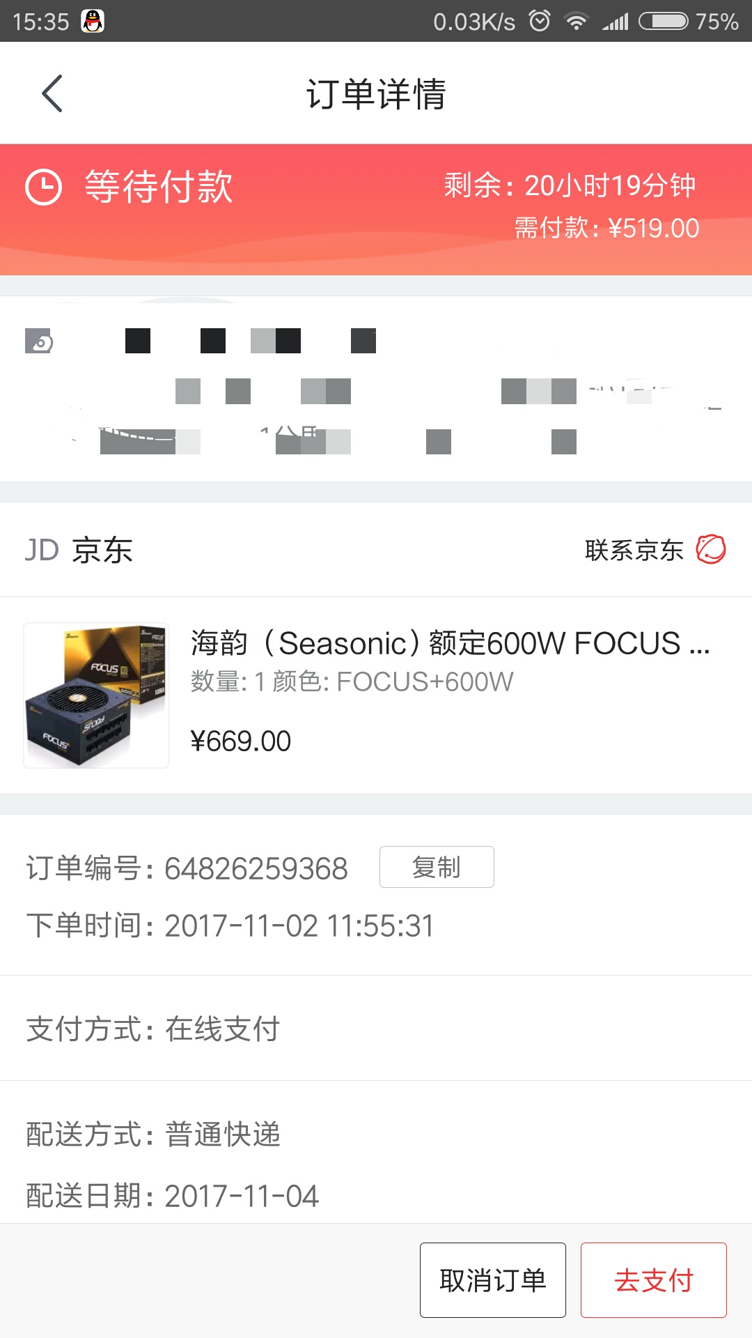 海韵(Seasonic)额定600W FOCUS+600FX 电源(80PLUS金牌/全模组/140mm尺寸/静音低载风扇转停/十年质保) 原价669