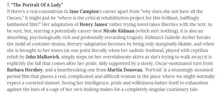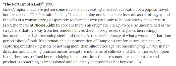 去年大家都热衷于评新千年后的榜单,今年又变着法儿开始玩上世纪90年代的影片,上层是英国Little White Lies的。最近The Playlist也在连载自己90年代的年度十佳,最后也会是100部。在1996年,提及了你妮和坎皮恩合作的《贵妇的画像》,个人感觉,随着女性导演地位逐渐的提升,这部一直被低估的影片势必获得更多的关照,我们拭目以待吧。