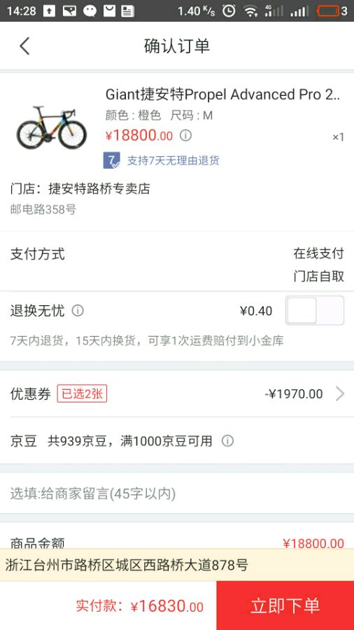 京东捷安特旗舰店配合神券 价格特别美好