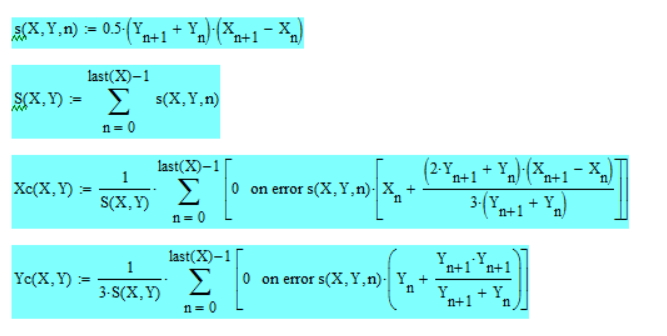 对于用散点定义的由直线型折线组成的封闭图形,也可以直接用给出的散点坐标计算。计算的思路就是把图形看作若干梯形(特例,矩形,零面积)的组合,直接用公式计算。下面是我刚推出的公式,没有经过严密的论证,或许有错,仅供参考。