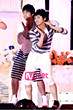 男人盯着妞看,估计心里想的是:呀西,臭小子,我跟她不过是逢场作戏,你倒挺真的啊,还给递水~!