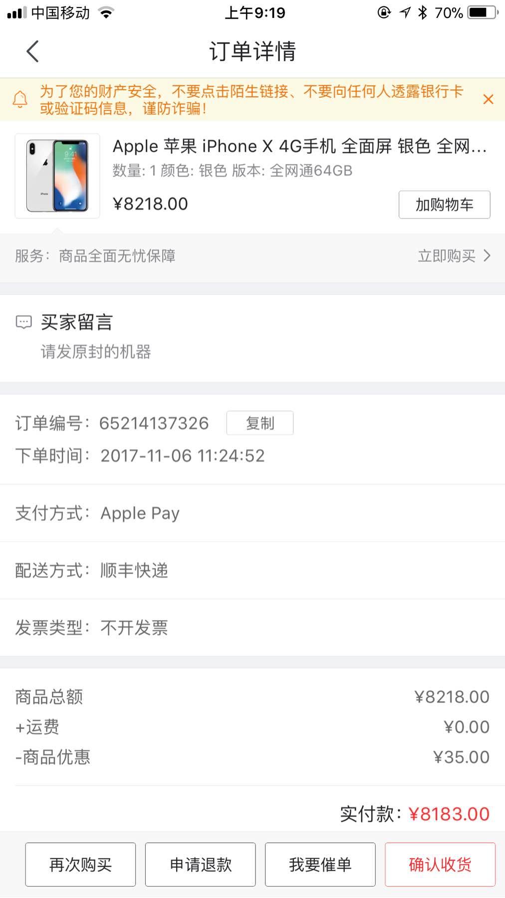 昨天下午3点下单 今天早上9点顺风送 不过我买了8500+将近8600