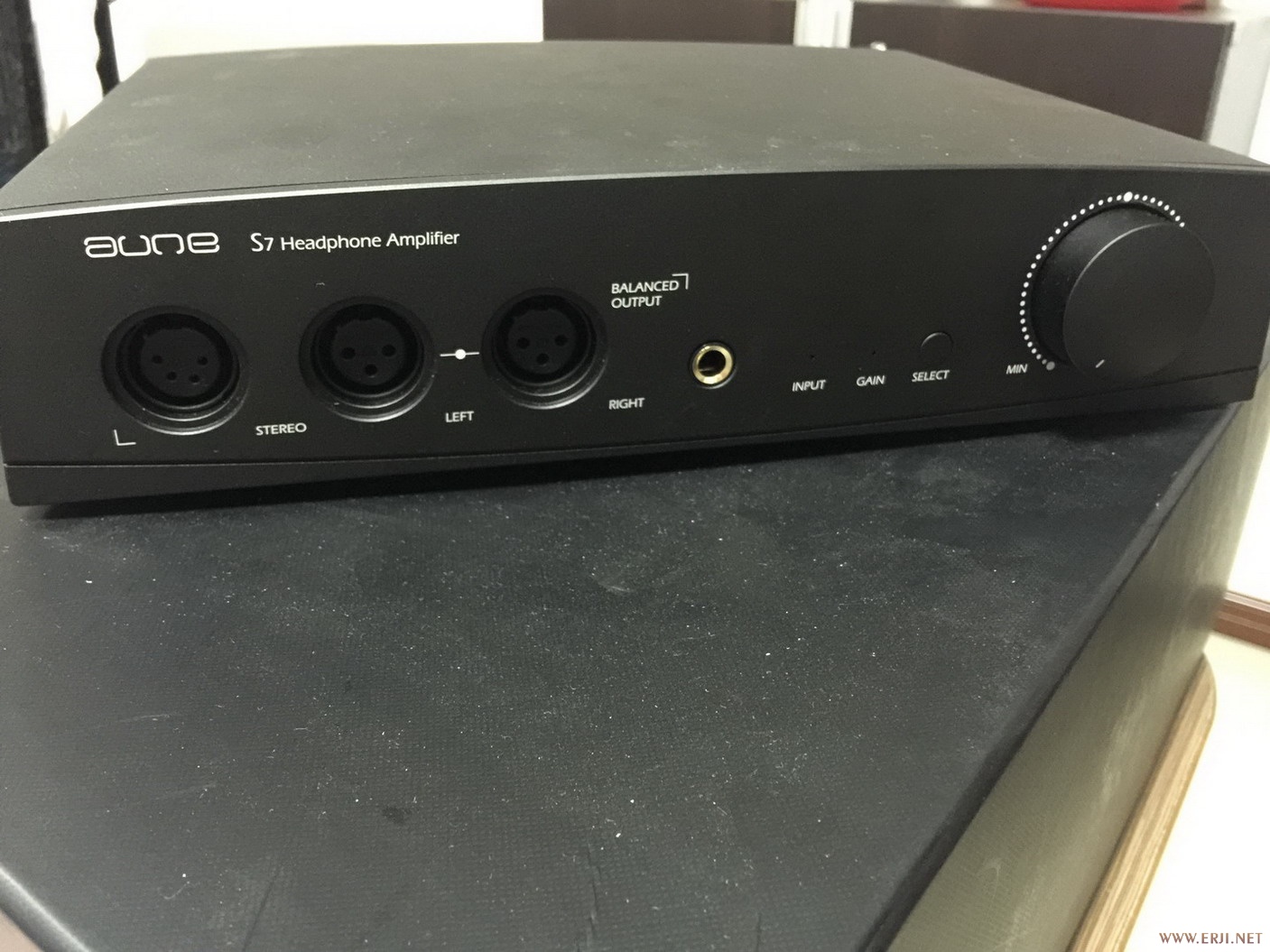 说起奥莱尔,S6刚出的那会,找过经销试听,结果给我寄来个S7,当时惊呆了,这货特么怎么跟图片里长得不一样,就算以实物为准,这区别还是有点大啊,后来看了标签才发现原来是S7。说回S7,前面面板那几个平衡口无时不透露着平衡耳放的气质。前面板除了耳机口、通道显示灯、增益灯和一个控制按钮。按钮单击切换通道,长按切换增益。增益灯绿色是低增益,红色高增益。可惜我手头耳机都没平衡线,所以这次就试单端口了。