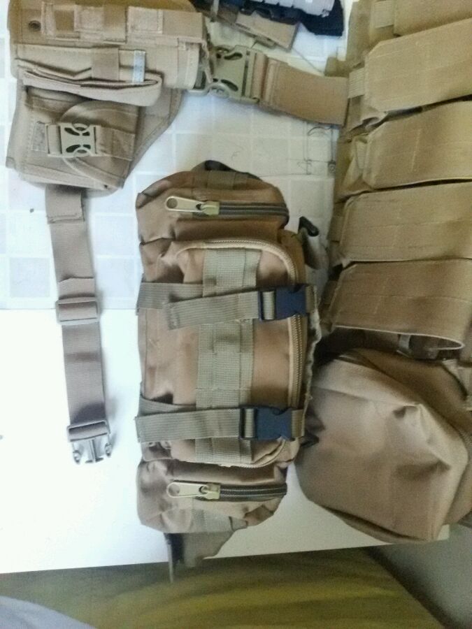 如图,钢丝幽灵背心(三联弹匣包,二联弹匣包,地图包,杂物袋,手枪弹匣包×2,对讲机包)