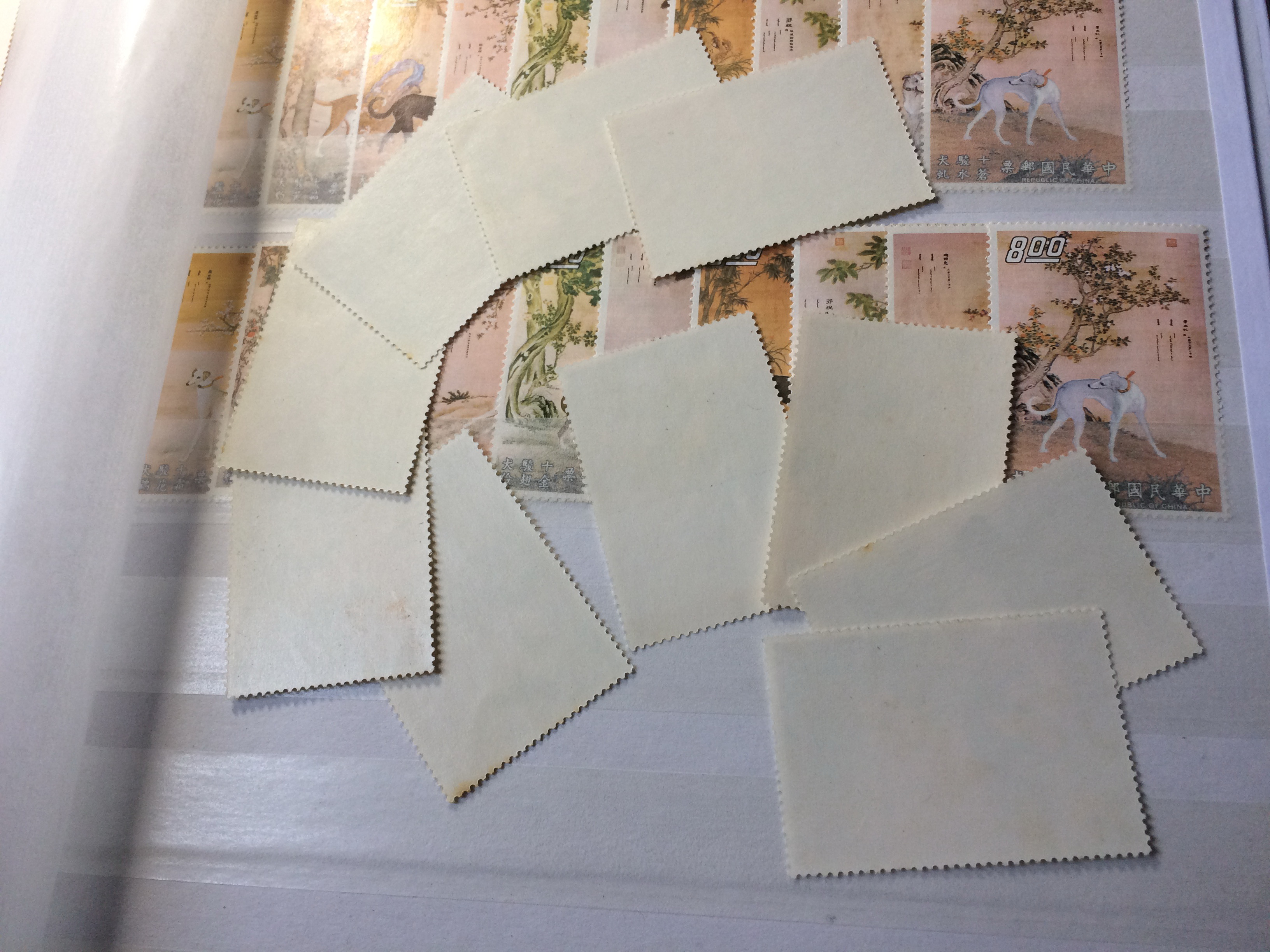 就两个品种十骏犬、十二月令,都是大块方连撕的原胶上品,面艳背不同程度的黄、斑,详见图