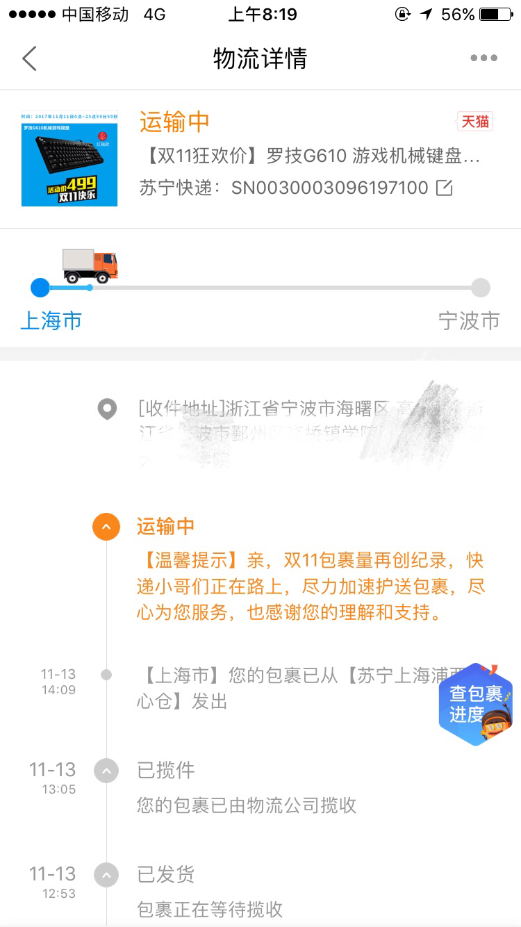 好像都卡在这,卡了一天了,我其实在怀疑是不是苏宁压根没有出货或者压根没有货(手机)