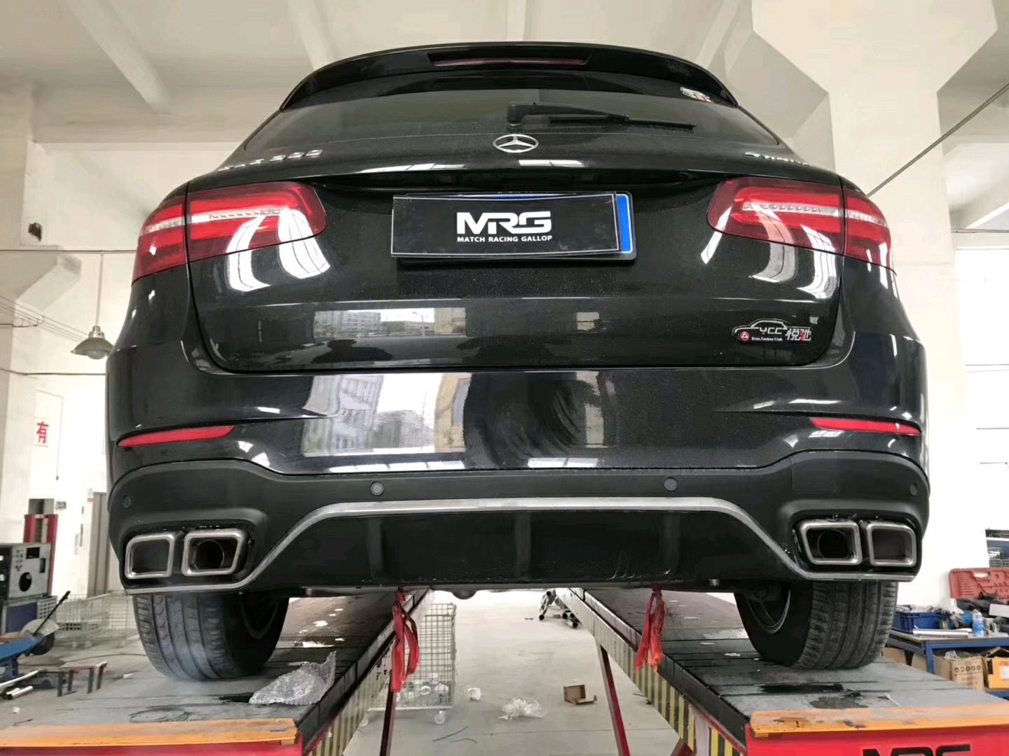 奔驰GLC260 改装MRG中尾段双边单出智能蓝牙无线遥控阀门排气!精准安装,声浪表现浑厚!